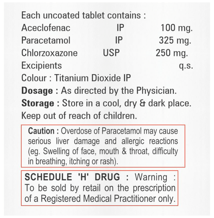 Aceclofenac (100mg) + Paracetamol (325mg) + Chlorzoxazone (250mg):<packagingdetail>:Strip:
