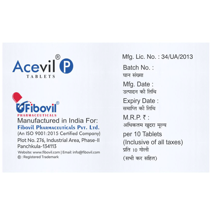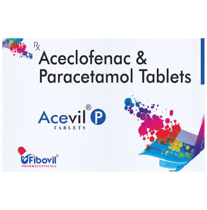 Acevil P Tablet is a pain-relieving medicine. It is used to reduce pain and inflammation in conditions like rheumatoid arthritis, ankylosing spondylitis, and osteoarthritis. It may also be used to relieve muscle pain, back pain, toothache, or pain in the ear and throat. Acevil P Tablet should be taken with or without food. You should take it regularly as advised by your doctor. Your doctor may change the dose and time between doses according to your pain level and your needs. Do not take more or use it for a longer duration than recommended by your doctor.Some of the common side effects of this medicine include nausea, vomiting, stomach pain, heartburn, and diarrhea. If any of these side effects bother you or do not go away with time, you should let your doctor know. Your doctor may help you with ways to reduce or prevent these side effects by prescribing an alternative medicine or adjusting the dose.Acevil P Tablet may not be suitable for everybody. Before taking it, let your doctor know if you have any problems with your heart, kidneys, liver, or have stomach ulcers. To make sure it is safe for you, let your doctor know about all the other medicines you are taking. Pregnant and breastfeeding mothers should first consult their doctors before using Acevil P Tablet.