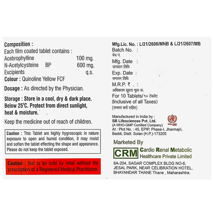 Acebrophylline (100mg) + Acetylcysteine (600mg):<packagingdetail>:Strip:
