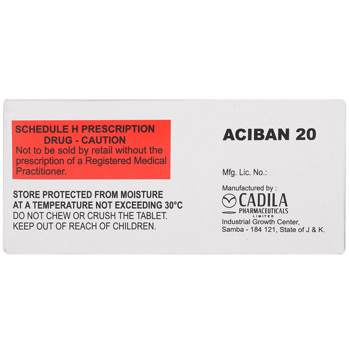 What is Aciban 20 Tablet used for?::: Aciban 20 Tablet is used for the treatment of peptic ulcer disease, reflux esophagitis or gastroesophageal reflux disease (GERD). Aciban 20 Tablet prevents acidity associated with use of painkillers. It is also used to treat a disease associated with excessive acid production in the stomach known as Zollinger Ellison syndrome (ZES). It works by reducing the amount of acid made by your stomach and thus relieves your symptoms.| How long does it take for Aciban 20 Tablet to work?::: You should start to feel better within 2 to 3 days. It may take up to 4 weeks for Aciban 20 Tablet to work properly so you may still have some symptoms during this time.| Is a single dose of Aciban 20 Tablet sufficient?::: No, a single dose may not be sufficient. However, with only a few doses of Aciban 20 Tablet you may get relief with the symptoms. Aciban 20 Tablet is usually needed only for a short term or upto 2 weeks for heartburn, indigestion, acid reflux. However, if need arises, such as for treating peptic ulcer disease and Zollinger Ellison syndrome (ZES), Aciban 20 Tablet may be prescribed for a long term duration as well. Please consult your doctor if you do not feel better even after taking Aciban 20 Tablet regularly for 2 weeks as prescribed.| Is Aciban 20 Tablet safe?::: Yes, Aciban 20 Tablet is relatively safe. Most of the people who take Aciban 20 Tablet do not get a side effect. It is advised to be taken as directed by the doctor for maximum benefits.| Can I take Aciban 20 Tablet for a long term?::: Aciban 20 Tablet is usually prescribed for short-term use only. However, if the need arises, such as for treating peptic ulcer disease, ZE syndrome, etc. Aciban 20 Tablet may be prescribed for a long-term duration as well. Long-term use may carry an increased risk for side effects and must be discussed with the doctor. Please use Aciban 20 Tablet as advised by your doctor and under their supervision.| What are the long term side effects of Aciban 20 Tablet?::: If Aciban 20 Tablet is used for more than 3 months, certain long-term side effects may be seen. The most important of these is low magnesium levels in your blood which may make you feel tired, confused, dizzy, shaky, or dizzy. You may also have muscle twitches or irregular heartbeat. If the use is further prolonged for more than a year, you may have an increased risk of bone fractures, stomach infections, and vitamin B12 deficiency. Vitamin B12 deficiency can make you anemic, as a result of which you may feel more tired, weak, or pale. Additionally, you may have palpitations, shortness of breath, lightheadedness, indigestion, loss of appetite, flatulence (gas), or nerve problems such as numbness, tingling, and problem in walking.| What is the best time to take Aciban 20 Tablet?::: Usually, Aciban 20 Tablet is taken once a day, first thing in the morning. If you take Aciban 20 Tablet twice a day, take 1 dose in the morning and 1 dose in the evening. The tablets should be swallowed whole (remember not to be chewed or crushed) and taken at least 1 hour before a meal with some water.| Can I stop taking Aciban 20 Tablet if I feel better?::: If you have been taking Aciban 20 Tablet for a long time. Stopping it abruptly may lead to increased acid production, thereby worsening your symptoms. Therefore, you must discuss any dose changes or if you wish to come off Aciban 20 Tablet.| Does Aciban 20 Tablet cause weight gain?::: Although rare but long-term treatment with Aciban 20 Tablet may cause weight gain. The reason could be the relief from reflux symptoms which could make you eat more. Consult your doctor for any weight-related concern.| Can I take alcohol with Aciban 20 Tablet?::: No, alcohol intake is not advised with Aciban 20 Tablet. Alcohol itself does not affect the working of Aciban 20 Tablet, but it can increase the acid production. This may further cause worsening of your symptoms.| Can I take antacids along with Aciban 20 Tablet?::: Yes, you can take antacids along with Aciban 20 Tablet. Take it 2 hours before or after you take Aciban 20 Tablet.| What dietary changes should I make to get relief from acidity?::: Aciban 20 Tablet is best taken 1 hour before a meal. You should avoid spicy and fatty foods while taking this medicine. You must refrain from caffeinated drinks such as tea, coffee and cola. Alcohol intake should also be avoided as it may worsen your symptoms.| Are painkillers safe to take along with Aciban 20 Tablet?::: Yes, it is safe to take painkillers along with Aciban 20 Tablet. Aciban 20 Tablet prevents acidity and stomach ulcers associated with the intake of painkillers. Aciban 20 Tablet is taken 1 hour before a meal. On the other hand, painkillers are usually taken with, or after a meal to avoid stomach upset.: