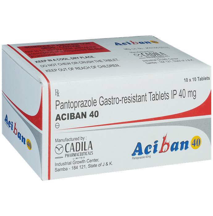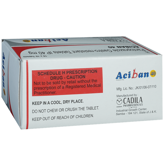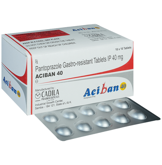 Aciban 40 Tablet is a medicine that reduces the amount of acid produced in your stomach. It is used for treating acid-related diseases of the stomach and intestine such as heartburn, acid reflux, peptic ulcer disease, and Zollinger-Ellison syndrome. It provides relief from the symptoms and promotes healing. Aciban 40 Tablet is also used to prevent stomach ulcers and acidity that may be seen with the prolonged use of painkillers. It belongs to a class of medicines known as proton pump inhibitors (PPIs). This medicine should be taken one hour before a meal, preferably in the morning. The dose will depend on your underlying condition and how you respond to the medicine. You should keep on taking it as prescribed even if your symptoms disappear quickly. You can increase the efficiency of the treatment by eating smaller meals more often and avoiding caffeinated drinks (like tea and coffee), and spicy or fatty foods.The most common side effects observed with this medicine include nausea, vomiting, headache, dizziness, flatulence, diarrhea, and stomach pain. These symptoms are generally mild but if they bother you or do not go away, consult your doctor. Long-term use of this medicine may lead to an increased risk of side effects. For instance, using this medicine for more than 1 year may increase your risk for bone fractures, especially with higher doses. Talk to your doctor about ways to prevent bone loss (osteoporosis), like taking calcium and vitamin D supplements.Before taking this medicine, you need to tell your doctor if you have severe liver problems, are taking medicines for HIV, have ever had an allergic reaction to similar medicines in the past, or suffer from bone loss (osteoporosis). Pregnant or breastfeeding women should also consult their doctor before taking it.