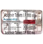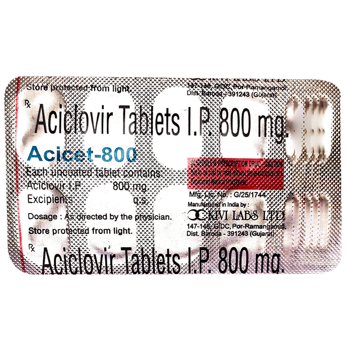 Acicet 800mg Tablet is an antiviral medicine. It helps in treating viral infections like herpes labialis, herpes simplex, shingles, genital herpes infection, and chickenpox. It prevents the multiplication of virus in human cells and therefore helps in clearing the infection. Acicet 800mg Tablet should be taken in the dose and duration as advised by your doctor. Do not skip any doses and finish the full course of treatment even if you feel better. Dissolve it in a glass of water before taking it. It may be taken with or without food, but it is better to take it at a fixed time. If you miss a dose, take it as soon as possible. However, if it is almost time for your next dose, skip the missed dose and go back to your regular schedule. Do not double the dose. You should drink plenty of water while on treatment with this medicine as it helps to prevent dehydration and kidney damage.Some side effects of this medicine include headache, dizziness, vomiting, nausea, fatigue, and fever. Inform your doctor if these side effects do not resolve or persist for a longer duration. Please consult your doctor if you are pregnant, planning to conceive or breastfeeding.
