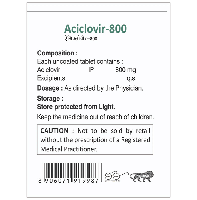 Will I get cured after taking Aciclovir 800 Tablet for shingles?::: Aciclovir 800 Tablet is an antiviral medicine effective against herpes simplex and varicella zoster viruses. It does not cure infections caused by these viruses but helps to minimize the symptoms and shorten the duration of infection. It does not remove the viruses from the body but prevents the viruses from dividing and spreading.| Does Aciclovir 800 Tablet prevent transmission of infection to others?::: No, you can infect other people, even while you are being treated with Aciclovir 800 Tablet. Herpes infections are contagious, so avoid letting infected areas come into contact with other people. Avoid touching your eyes after touching an infected area. Wash your hands frequently to prevent transmitting the infection to others. You should practice safe sex by using condoms. You should not have sex if you have genital sores or blisters.| What are the serious side effects of Aciclovir 800 Tablet?::: Serious side effects are rare, but if you experience them, you should seek medical advice right away. These rare side effects include hives, blistering or peeling rash, yellow skin or eyes, unusual bruising or bleeding, loss of consciousness, fits, difficulty in breathing, hallucinations and swelling of the face, tongue, lips or throat.| Do elderly patients need to be more careful while taking Aciclovir 800 Tablet?::: Older adults (over age 65 years) tend to experience more side effects when taking Aciclovir 800 Tablet. The reason being, their kidneys do not flush the drug out of their system as quickly as a younger person’s kidneys would do. Elderly patients should drink plenty of water while taking Aciclovir 800 Tablet, and their kidney function should be monitored. These patients should be given a lower dose and should be monitored for neurological problems.| What can happen if somebody takes more than the recommended dose of Aciclovir 800 Tablet accidentally?::: Accidental, repeated overdoses of oral Aciclovir 800 Tablet over several days have resulted in nausea, vomiting, confusion and headache. Consult your doctor in case of overdose.| Can I get resistant to Aciclovir 800 Tablet treatment?::: Patients with advanced HIV disease or patients with an impaired immunity have reported resistance to Aciclovir 800 Tablet. If you are not responding to Aciclovir 800 Tablet, the possibility of drug resistance should be checked.| Is hair loss caused due to Aciclovir 800 Tablet permanent?::: Hair loss is an uncommon side effect of Aciclovir 800 Tablet. It stops when the medicine is discontinued.:
