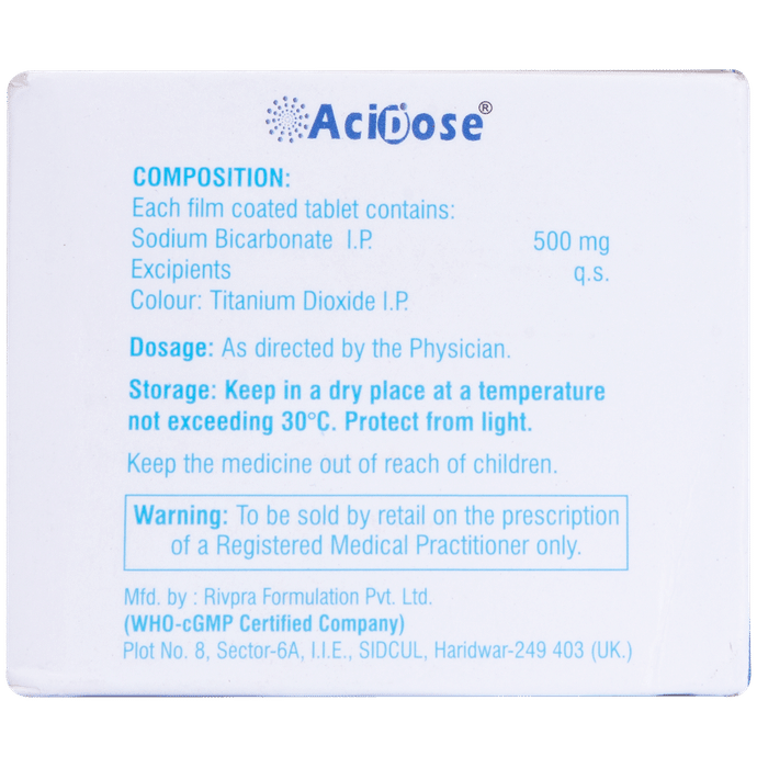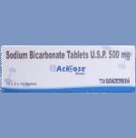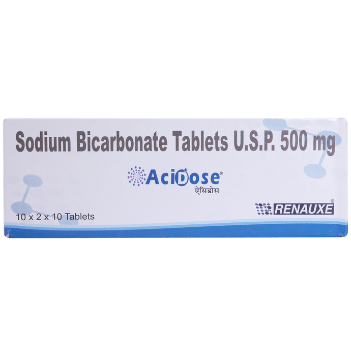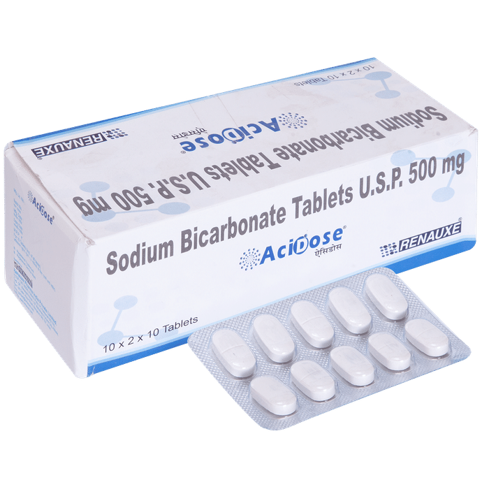 Acidose 500mg Tablet is an antacid used in the treatment of indigestion, metabolic acidosis and used as an alkalinizing agent. It acts as a buffer that helps neutralize excess acid and restore a healthier pH level in the body. Acidose 500mg Tablet relieves irritation by producing carbon dioxide which neutralizes the acid present in the stomach. It also increases the pH of blood and urine, thereby correcting acid indigestion, heartburn. Additionally, it helps in the removal of toxic substances from the body in certain types of poisoning.Acidose 500mg Tablet may be taken with or without food in a dose and duration as advised by the doctor. Excessive intake may cause electrolyte imbalance leading to unwanted side effects. Keep taking this medicine for as long as your doctor recommends. If you stop treatment too early your symptoms may come back and your condition may worsen.Common side effects of this medicine include high sodium levels, cerebral edema, alkalosis, and hypokalemia. Let your doctor know if any of these side effects persist or get worse. They may be able to help by adjusting the dosage or by prescribing you an alternate medicine.It is important to consult a doctor before taking Acidose 500mg Tablet if you are suffering from stomach and kidney disease. Let your doctor also know about all other medications you are taking as some may affect, or be affected by this medicine. Pregnant or breastfeeding women should also consult their doctor before taking this medicine.