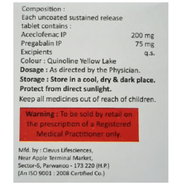 Aceclofenac (200mg) + Pregabalin (75mg):<packagingdetail>:Strip: