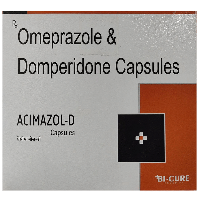 Is it safe to use Acimazol-D Capsule?::: Yes, Acimazol-D Capsule is safe for most of the patients. However, in some patients it may cause common side effects like diarrhea, stomach pain, flatulence, dryness in the mouth, dizziness, headache and other uncommon and rare side effects. Inform your doctor if you experience any persistent problem while taking this medicine.| What are the contraindications of Acimazol-D Capsule?::: The use of Acimazol-D Capsule is considered to be harmful in patients with a known hypersensitivity to omeprazole or domperidone or any other inactive ingredients present in the medicine. Cautious use is advised in patients with underlying kidney or liver disease.| What is the best time to take Acimazol-D Capsule?::: It is best to take the medicine daily before breakfast or on an empty stomach.| Can the use of Acimazol-D Capsule cause abnormal heartbeat?::: Yes, the use of Acimazol-D Capsule can cause an increased risk of irregular heartbeat (serious arrhythmias). These are serious side effects but the chances that it may happen is very low. The risk may be slightly higher in those who are more than 60 years of age.| Does the use of Acimazol-D Capsule lead to dry mouth?::: Yes, the use of Acimazol-D Capsule can cause dry mouth. Dryness of mouth occurs due to Domperidone, which is present in this combination. If you experience dry mouth, drink plenty of water. Take regular sips of water during the day and keep some water on your bedside at night. Cut down the intake of alcohol and avoid smoking. If you have dry mouth, try to use alcohol-free mouthwash as its use increases the risk of tooth decay.| What is the recommended storage condition for Acimazol-D Capsule?::: Keep this medicine in the container or pack it came in, tightly closed. Store it according to the instructions mentioned on the pack or label. Dispose of the unused medicine. Make sure it is not consumed by pets, children and other people.: