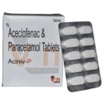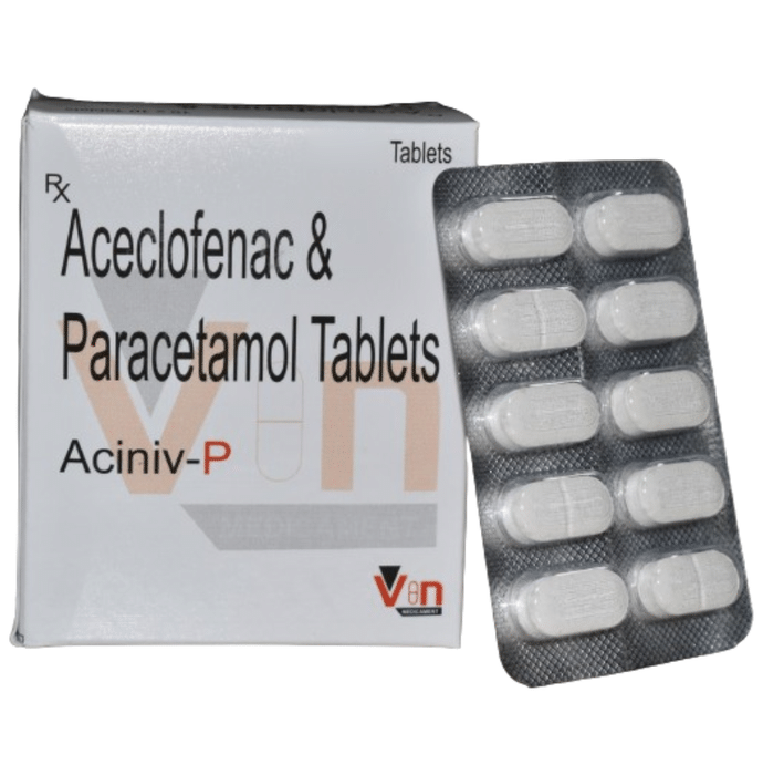 What is Aciniv-P Tablet?::: Aciniv-P Tablet is a combination of two medicines: Aceclofenac and Paracetamol. This medication helps in relieving pain and inflammation. It works by lowering the levels of chemical substances in the body that cause pain and inflammation.| Is it safe to use Aciniv-P Tablet?::: Aciniv-P Tablet is safe for most of the patients. However, in some patients it may cause some unwanted common side effects like nausea, vomiting, stomach pain, heartburn, diarrhea and other uncommon and rare side effects.| Can I stop taking Aciniv-P Tablet when my pain is relieved?::: If you are using the medication for a condition associated with long-term pain then Aciniv-P Tablet should be continued for as long as advised by your physician. It can be discontinued if you are using it for short-term pain relief.| Can the use of Aciniv-P Tablet cause nausea and vomiting?::: Yes, the use of Aciniv-P Tablet can cause nausea and vomiting. Taking it with milk, food or with antacids can prevent nausea. Avoid taking fatty or fried foods along with this medication. In case of vomiting drink plenty of water or other fluids by taking small frequent sips. Talk to your doctor if vomiting persists and you notice signs of dehydration, like dark colored and strong-smelling urine and a low frequency of urination. Do not take any other medicine without speaking to your doctor.| Can the use of Aciniv-P Tablet cause dizziness?::: Yes, the use of Aciniv-P Tablet can cause dizziness (feeling faint, weak, unsteady or lightheaded) in some patients. If you feel dizzy or lightheaded, it is better to rest for sometime and resume once you feel better.| Are there any specific contraindications associated with the use of Aciniv-P Tablet?::: The use of Aciniv-P Tablet is considered to be harmful for patients with known allergy to any of the components or excipients of this medicine or in patients with known allergy to other painkillers (NSAIDs). It should preferably be avoided in patients with a history of stomach ulcers or in patients with active, recurrent stomach ulcer/bleeding. It should also be avoided in patients with a history of heart failure, high blood pressure, and liver or kidney disease.| Can Aciniv-P Tablet be taken with vitamin B-complex?::: Yes, Aciniv-P Tablet can be taken with vitamin B-complex preparations. While Aciniv-P Tablet helps to relieve pain, vitamin B-complex can help to correct the vitamin deficiency that might be causing the underlying painful condition.| Is Aciniv-P Tablet helpful in relieving stomach pain?::: No, Aciniv-P Tablet preferably should not be taken for stomach pain without consulting a physician. This drug can increase stomach acid secretion which may aggravate an unknown underlying condition.| Can the use of Aciniv-P Tablet cause damage to kidneys?::: Yes, the long-term use of Aciniv-P Tablet can cause damage to the kidneys. Normal kidneys produce a chemical messenger called prostaglandins that protects them from damage. Use of painkillers lowers the levels of prostaglandins in the body which leads to kidney damage on long-term use. Use of painkillers is not recommended to patients with underlying kidney disease.| Is it safe to take a higher dose of Aciniv-P Tablet than recommended?::: No, taking higher than the recommended dose of Aciniv-P Tablet can lead to increased chances of side effects like nausea, vomiting, heartburn, indigestion, diarrhea and can also damage your kidneys on long-term use. If you are experiencing increased severity of pain or if the pain is not relieved by the recommended doses of this medicine, please consult your doctor for re-evaluation.| What are the instructions for storage and disposal of Aciniv-P Tablet?::: Keep this medicine in the container or the pack it came in, tightly closed. Store it according to the instructions mentioned on the pack or label. Dispose of the unused medicine. Make sure it is not consumed by pets, children and other people.| How long does it take for Aciniv-P Tablet to show results?::: The effect of Aciniv-P Tablet can be seen within 1.5 to 3 hours of oral administration of the medicine and the time taken to show the desired effects may vary with every individual patient.| What is the dosage of Aciniv-P Tablet?::: You may take one tablet of Aciniv-P Tablet twice daily or as prescribed by your doctor. Always follow your doctor’s instructions while taking this medicine.| Can I take Aciniv-P Tablet along with other painkiller tablets?::: No, it is not recommended to take Aciniv-P Tablet with other painkiller medicines without consulting your doctor since it may cause unwanted side effects like stomach pain or ulcers.| Can Aciniv-P Tablet be given to children?::: No, Aciniv-P Tablet is not recommended for use in children under the age of 18 years.: