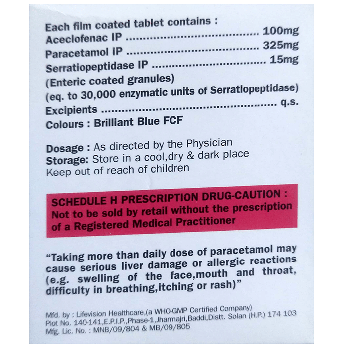 Aceclofenac (100mg) + Paracetamol (325mg) + Serratiopeptidase (15mg):<packagingdetail>:Strip: