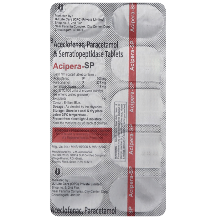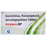 In Pain relief Acipera-SP Tablet is a combination medicine used for short-term relief of pain, inflammation, and swelling in conditions affecting joints and muscles. It works by blocking chemical messengers in the brain that tell us we have pain. It can help relieve pain in conditions like rheumatoid arthritis and osteoarthritis. Along with painkillers, this medicine also contains an active ingredient called Serratiopeptidase, which is an enzyme that promotes the overall healing process and speeds up recovery.u003cbr>u003cbr>Take it as it is prescribed to get the most benefit. Do not take more or longer than needed as that can be dangerous. In general, you should take the lowest dose that works, for the shortest possible time. This will help you to go about your daily activities more easily and have a better, more active, quality of life.