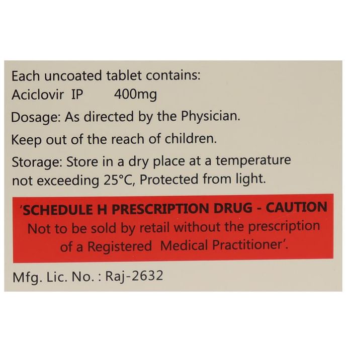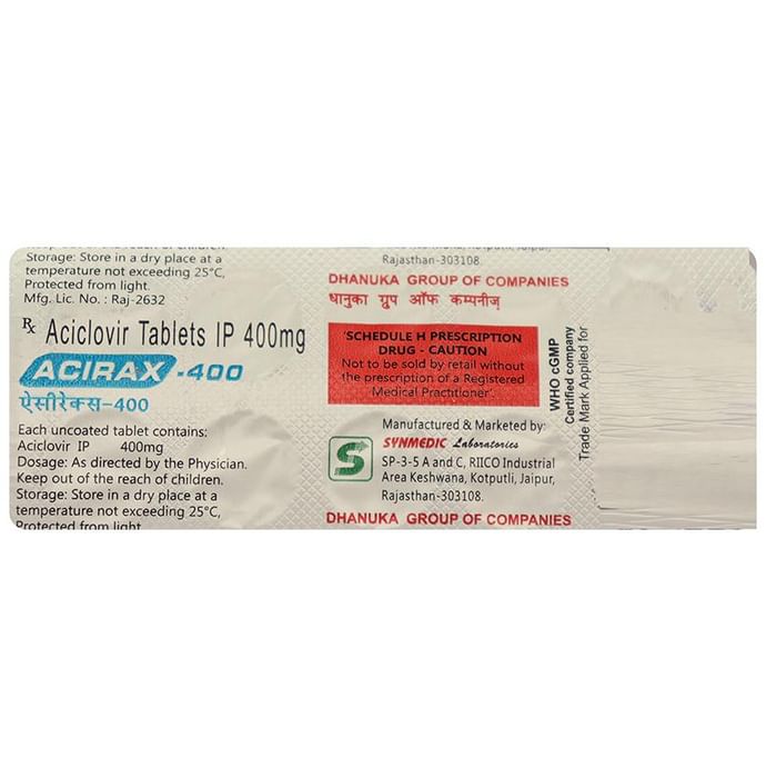 Acirax 400 Tablet is an antiviral medicine. It helps in treating viral infections like herpes labialis, herpes simplex, shingles, genital herpes infection, and chickenpox. It prevents the multiplication of virus in human cells and therefore helps in clearing the infection. Acirax 400 Tablet should be taken in the dose and duration as advised by your doctor. Do not skip any doses and finish the full course of treatment even if you feel better. Dissolve it in a glass of water before taking it. It may be taken with or without food, but it is better to take it at a fixed time. If you miss a dose, take it as soon as possible. However, if it is almost time for your next dose, skip the missed dose and go back to your regular schedule. Do not double the dose. You should drink plenty of water while on treatment with this medicine as it helps to prevent dehydration and kidney damage.Some side effects of this medicine include headache, dizziness, vomiting, nausea, fatigue, and fever. Inform your doctor if these side effects do not resolve or persist for a longer duration. Please consult your doctor if you are pregnant, planning to conceive or breastfeeding.