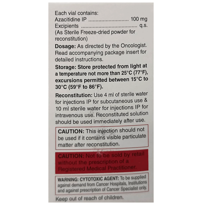 In Blood cancer Blood cancer, also called leukemia, is a cancer of the blood-forming tissues, that decreases the body’s ability to fight infection. Acitakrish 100mg Injection kills or stops the growth of cancer cells and also prevents the multiplication of cancer cells. It is a potent and very toxic medicine and you should discuss the risks and benefits with your doctor. You should avoid drinking alcohol while having this treatment and drink plenty of water to stay hydrated.