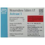 How long do I need to take Acitrom 1 Tablet?::: You should continue taking Acitrom 1 Tablet for as long as recommended by your doctor. Depending upon the condition you are being treated for, you may have to take it for several months or years or maybe for the rest of your life.| What should I avoid while taking Acitrom 1 Tablet?::: You should avoid alcohol while taking Acitrom 1 Tablet as alcohol may interfere with working of Acitrom 1 Tablet. In addition to that, avoid cranberry juice or other cranberry products as there may be a risk of enhanced blood thinning. Avoid breastfeeding or getting pregnant as it may harm your child.| Do I need to stop Acitrom 1 Tablet if I have to undergo a surgery?::: Depending on the type of surgery that is to be performed, your doctor will tell you whether to continue or stop Acitrom 1 Tablet. It will be decided by your doctor after weighing the risks and benefits of discontinuing Acitrom 1 Tablet.| Is Acitrom 1 Tablet same as warfarin?::: Both Acitrom 1 Tablet and warfarin are blood thinners, but they have some differences. Warfarin has a more stable blood thinning effect.| How long does it take for Acitrom 1 Tablet to start working?::: It takes a little longer for Acitrom 1 Tablet to start working. On an average, it may take 2-3 days for Acitrom 1 Tablet to show its blood-thinning effect. For these 2-3 days, heparin may be used and then discontinued.| What if I forget to take a dose?::: If you forget to take a dose of Acitrom 1 Tablet, take it as soon as you remember. However, if it is time for your next dose then skip the missed dose. Do not double the dose and continue your normal schedule. Keep a diary or set a reminder, so that you do not forget it often.| What monitoring is required while taking Acitrom 1 Tablet?::: The bleeding times should be carefully monitored from 2nd or 3rd dose of Acitrom 1 Tablet and till the clotting status is stabilized. Thereafter, the bleeding time can be monitored monthly. This frequency may be more in elderly.: