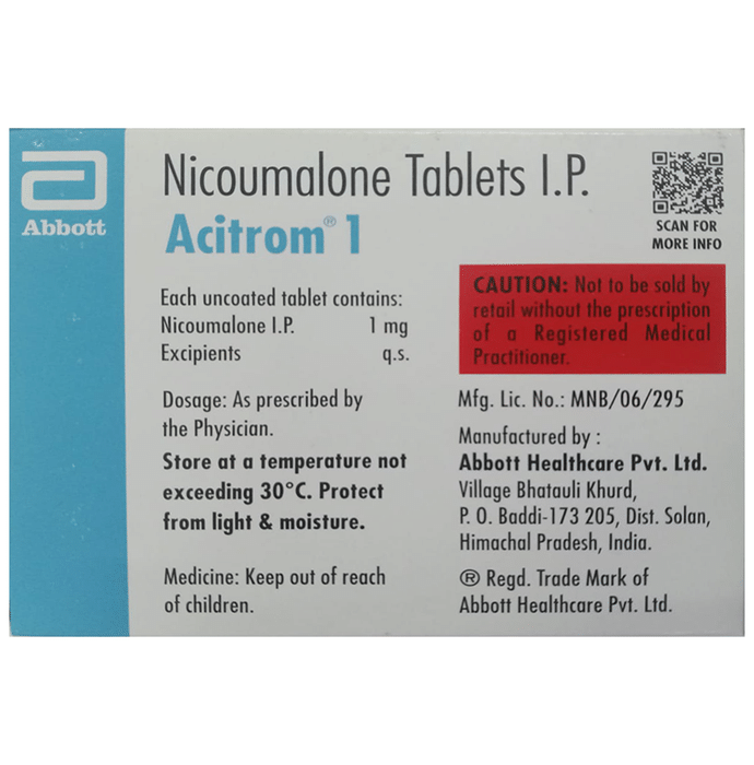 Acitrom 1 Tablet is an oral anticoagulant that helps prevent harmful blood clots in the legs, lungs, brain, and heart. It is used for deep vein thrombosis, pulmonary embolism, and stroke prevention. Acitrom 1 Tablet should be taken as advised by the doctor. You may take it with or without food but it is better to take it at a fixed time. This medicine should not be stopped abruptly without consulting the doctor. You should take this medicine regularly to get the most benefit, even if you feel fine. It is preventing future harm.Use of this medicine may increase your risk of bleeding. Let your doctor know immediately if you see a pinpoint rash or blood in your vomits, urine, or stool. If you are going under any surgery or dental treatment, you may need to stop this medicine for some time but only after consulting with your doctor.Before taking it, you must inform the doctor if you are suffering from any kidney or liver disease. Also, let your doctor know if you are pregnant or breastfeeding and about all the other medications that you are taking regularly.
