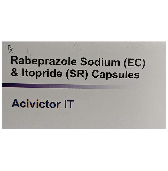 Acivictor IT Capsule SR is a combination medicine used to treat gastroesophageal reflux disease (Acid reflux) and peptic ulcer disease by relieving the symptoms of acidity such as heartburn, stomach pain, or irritation. It also neutralizes the acid and promotes easy passage of gas to reduce stomach discomfort. Acivictor IT Capsule SR is taken with or without food in a dose and duration as advised by the doctor. The dose you are given will depend on your condition and how you respond to the medicine. You should keep taking this medicine for as long as your doctor recommends. If you stop treatment too early your symptoms may come back and your condition may worsen. Let your healthcare team know about all other medications you are taking as some may affect, or be affected by this medicine.The most common side effects are stomach pain, diarrhea, constipation, headache, flatulence, weakness, and increased saliva production. Most of these are temporary and usually resolve with time. Contact your doctor straight away if you are at all concerned about any of these side effects. This medicine may cause dizziness and sleepiness, so do not drive or do anything that requires mental focus until you know how this medicine affects you. Avoid drinking alcohol while taking this medicine as it can worsen your sleepiness. Lifestyle modifications like having cold milk and avoiding hot tea, coffee, spicy food or chocolate can help you to get better results.Before you start taking this medicine it is important to inform your doctor if you are suffering from liver disease. You should also tell your doctor if you are pregnant, planning pregnancy or breastfeeding.