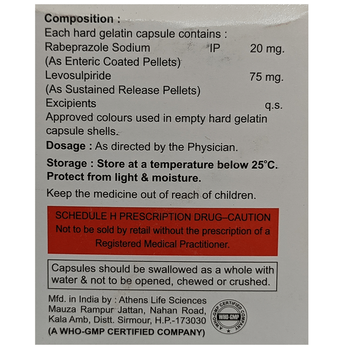 Levosulpiride (75mg) + Rabeprazole (20mg):<packagingdetail>:Strip: