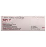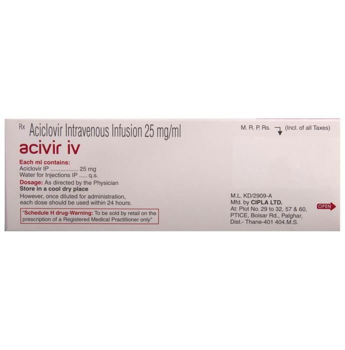 Will I get cured after taking Acivir IV Injection for shingles?::: Acivir IV Injection is an antiviral medicine effective against herpes simplex and varicella zoster viruses. It does not cure infections caused by these viruses but helps to minimize the symptoms and shorten the duration of infection. It does not remove the viruses from the body but prevents the viruses from dividing and spreading.| How is Acivir IV Injection administered?::: Acivir IV Injection should be administered under the supervision of a trained healthcare professional or a doctor only and should not be self-administered. It is given by slow intravenous (I.V) infusion over a one hour period to avoid damage to kidneys. The dose will depend on the condition you are being treated for and will be decided by your doctor. Follow your doctor’s instructions carefully to get maximum benefit from Acivir IV Injection.| Does Acivir IV Injection prevent transmission of infection to others?::: No, you can infect other people, even while you are being treated with Acivir IV Injection. Herpes infections are contagious, so avoid letting infected areas come into contact with other people. Avoid touching your eyes after touching an infected area. Wash your hands frequently to prevent transmitting the infection to others. You should practice safe sex by using condoms. You should not have sex if you have genital sores or blisters.| What are the serious side effects of Acivir IV Injection?::: Serious side effects are rare, but if you experience them, you should seek medical advice right away. These rare side effects include hives, blistering or peeling rash, yellow skin or eyes, unusual bruising or bleeding, loss of consciousness, fits, difficulty in breathing, hallucinations and swelling of the face, tongue, lips or throat.| Do elderly patients need to be more careful while taking Acivir IV Injection?::: Older adults (over age 65 years) tend to experience more side effects when taking Acivir IV Injection. The reason being, their kidneys do not flush the drug out of their system as quickly as a younger person’s kidneys would do. Elderly patients should drink plenty of water while taking Acivir IV Injection, and their kidney function should be monitored. These patients should be given a lower dose and should be monitored for neurological problems.| What can happen if somebody takes more than the recommended dose of Acivir IV Injection accidentally?::: Accidental, repeated overdoses of oral Acivir IV Injection over several days have resulted in nausea, vomiting, confusion and headache. Consult your doctor in case of overdose.| Can I get resistant to Acivir IV Injection treatment?::: Patients with advanced HIV disease or patients with an impaired immunity have reported resistance to Acivir IV Injection. If you are not responding to Acivir IV Injection, the possibility of drug resistance should be checked.| Is hair loss caused due to Acivir IV Injection permanent?::: Hair loss is an uncommon side effect of Acivir IV Injection. It stops when the medicine is discontinued.: