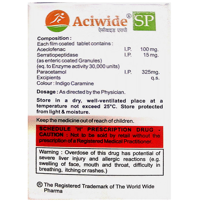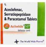 What is Aciwide SP Tablet?::: It is a combination of three medicines: Aceclofenac, Paracetamol, and Serratiopeptidase. This medication helps in relieving pain and inflammation. It works by lowering the levels of chemical substances in the body that cause pain and inflammation.| Is it safe to take Aciwide SP Tablet?::: It is safe to take this medicine for most of the patients. However, in some patients, it may cause unwanted side effects like nausea, vomiting, stomach pain, heartburn, and diarrhea. If you experience any persistent problem due to the medication, inform your doctor as soon as possible.| Can I stop taking Aciwide SP Tablet when my pain is relieved?::: This medicine is usually used for the short term and can be discontinued when your pain is relieved. However, continued taking it if your doctor has advised you to do so.| Can Aciwide SP Tablet cause nausea and vomiting?::: Yes, the use of this medicine can cause nausea and vomiting. In case you experience nausea while taking this medicine, take it with milk, food, or with antacids. Avoid taking fatty or fried foods along with this medication. In case of vomiting, drink plenty of water or other fluids by taking small frequent sips. Talk to your doctor if vomiting persists and you notice signs of dehydration, like dark colored and strong-smelling urine and a low frequency of urination. Do not take any other medicines without speaking to your doctor.| Can Aciwide SP Tablet cause dizziness?::: Yes, the use of this medicine can cause dizziness (feeling faint, weak, unsteady or lightheaded) in some patients. If you feel dizzy or lightheaded, it is better to rest for sometime and resume once you feel better.| Are there any specific contraindications associated with taking Aciwide SP Tablet?::: The use of this medicine is considered harmful for patients with known allergy to any of the components or excipients of this medicine or in patients with known allergy to other painkillers (NSAIDs). Its use should preferably be avoided in patients with a history of stomach ulcers or in patients with active, recurrent stomach ulcers/bleeding. It should also be avoided in patients with a history of heart failure, high blood pressure, and liver or kidney disease.| Can I take Aciwide SP Tablet with vitamin B-complex?::: Yes, this medicine can be taken with vitamin B-complex preparations. While it helps to relieve pain, vitamin B-complex can help to correct the vitamin deficiency that might be causing your symptoms.| Can the use of Aciwide SP Tablet cause damage to kidneys?::: Yes, long-term use of this medicine can cause damage to the kidneys. Normal kidneys produce a chemical called prostaglandins that protect them from damage. The use of painkillers lowers the levels of prostaglandins in the body, which leads to kidney damage on long-term use. The use of painkillers is not recommended in patients with underlying kidney disease.| Can I take a higher dose of Aciwide SP Tablet than recommended?::: No, taking a higher than recommended dose can lead to increased chances of side effects. If you are experiencing increased severity of pain or the pain is not relieved by the recommended doses, please consult your doctor for re-evaluation.| What are the instructions for storage and disposal of Aciwide SP Tablet?::: Keep this medicine in the packet or the container it came in, tightly closed. Store it according to the instructions mentioned on the pack or label. Dispose of the unused medicine. Make sure it is not consumed by pets, children and other people.: