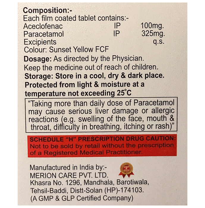 Aceclofenac (100mg) + Paracetamol (325mg):<packagingdetail>:Strip: