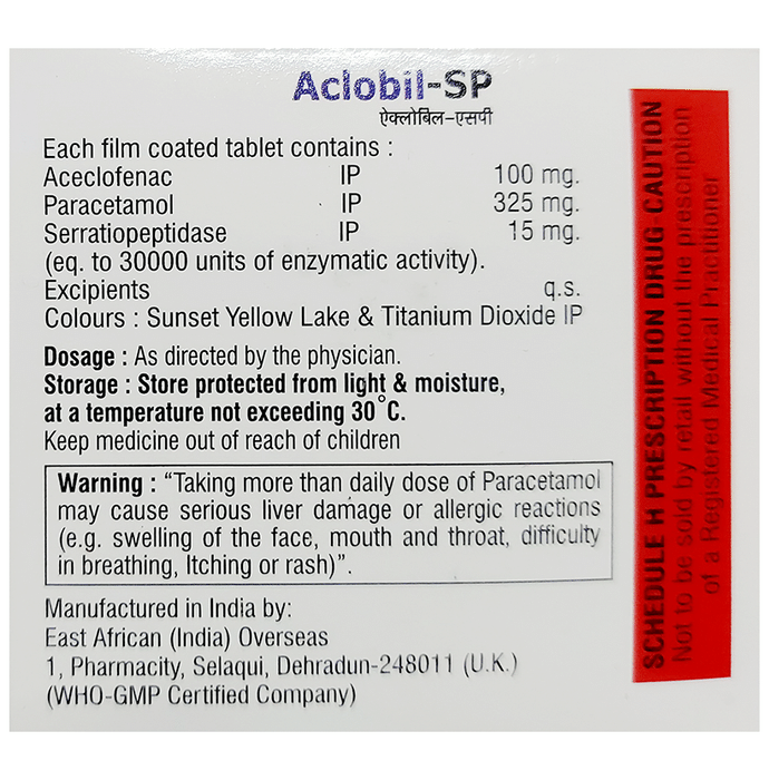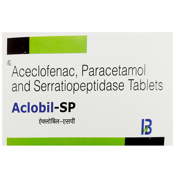 What is Aclobil-SP Tablet?::: It is a combination of three medicines: Aceclofenac, Paracetamol, and Serratiopeptidase. This medication helps in relieving pain and inflammation. It works by lowering the levels of chemical substances in the body that cause pain and inflammation.| Is it safe to take Aclobil-SP Tablet?::: It is safe to take this medicine for most of the patients. However, in some patients, it may cause unwanted side effects like nausea, vomiting, stomach pain, heartburn, and diarrhea. If you experience any persistent problem due to the medication, inform your doctor as soon as possible.| Can I stop taking Aclobil-SP Tablet when my pain is relieved?::: This medicine is usually used for the short term and can be discontinued when your pain is relieved. However, continued taking it if your doctor has advised you to do so.| Can Aclobil-SP Tablet cause nausea and vomiting?::: Yes, the use of this medicine can cause nausea and vomiting. In case you experience nausea while taking this medicine, take it with milk, food, or with antacids. Avoid taking fatty or fried foods along with this medication. In case of vomiting, drink plenty of water or other fluids by taking small frequent sips. Talk to your doctor if vomiting persists and you notice signs of dehydration, like dark colored and strong-smelling urine and a low frequency of urination. Do not take any other medicines without speaking to your doctor.| Can Aclobil-SP Tablet cause dizziness?::: Yes, the use of this medicine can cause dizziness (feeling faint, weak, unsteady or lightheaded) in some patients. If you feel dizzy or lightheaded, it is better to rest for sometime and resume once you feel better.| Are there any specific contraindications associated with taking Aclobil-SP Tablet?::: The use of this medicine is considered harmful for patients with known allergy to any of the components or excipients of this medicine or in patients with known allergy to other painkillers (NSAIDs). Its use should preferably be avoided in patients with a history of stomach ulcers or in patients with active, recurrent stomach ulcers/bleeding. It should also be avoided in patients with a history of heart failure, high blood pressure, and liver or kidney disease.| Can I take Aclobil-SP Tablet with vitamin B-complex?::: Yes, this medicine can be taken with vitamin B-complex preparations. While it helps to relieve pain, vitamin B-complex can help to correct the vitamin deficiency that might be causing your symptoms.| Can the use of Aclobil-SP Tablet cause damage to kidneys?::: Yes, long-term use of this medicine can cause damage to the kidneys. Normal kidneys produce a chemical called prostaglandins that protect them from damage. The use of painkillers lowers the levels of prostaglandins in the body, which leads to kidney damage on long-term use. The use of painkillers is not recommended in patients with underlying kidney disease.| Can I take a higher dose of Aclobil-SP Tablet than recommended?::: No, taking a higher than recommended dose can lead to increased chances of side effects. If you are experiencing increased severity of pain or the pain is not relieved by the recommended doses, please consult your doctor for re-evaluation.| What are the instructions for storage and disposal of Aclobil-SP Tablet?::: Keep this medicine in the packet or the container it came in, tightly closed. Store it according to the instructions mentioned on the pack or label. Dispose of the unused medicine. Make sure it is not consumed by pets, children and other people.: