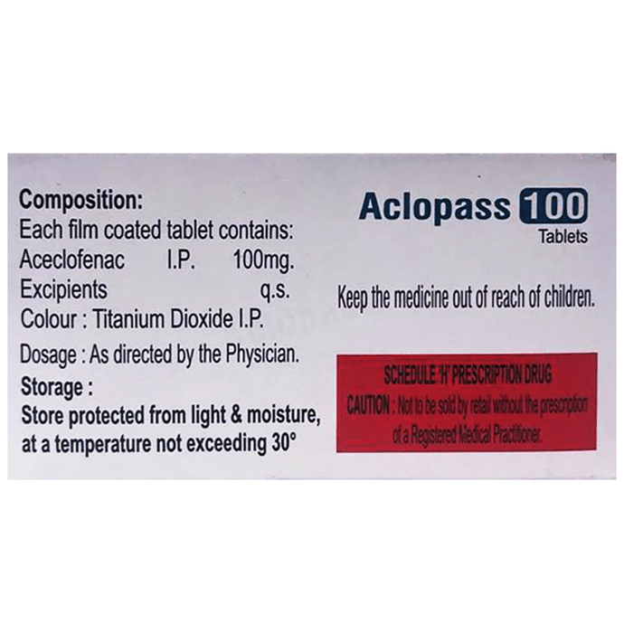 Is Aclopass 100 Tablet a good painkiller?::: Aclopass 100 Tablet is effective in relieving pain and inflammation. It is used to provide relief from various sorts of pain such as sprains, strains and other injuries. It is also helpful in various types of arthritis, gout, pain and inflammation following surgery.| Is Aclopass 100 Tablet safe?::: Aclopass 100 Tablet is safe if used in the dose and duration advised by your doctor. Take it exactly as directed and do not skip any dose. Follow your doctor’s instructions carefully and let your doctor know if any of the side effects bother you.| Does Aclopass 100 Tablet get you high?::: No, Aclopass 100 Tablet does not get you high. It does not have an abuse potential (drug-seeking behavior) and does not cause physical or psychological dependence. However, if you do not feel well, consult your doctor.| Can Aclopass 100 Tablet hurt your kidneys?::: Long-term use and high doses of Aclopass 100 Tablet may cause renal problems, such as protein or blood in urine and pain during urination. Patients who had or have heart failure, impaired kidney function and hypertension are at risk of kidney problems. The risk of developing kidney problems is also high in patients who are on medicines which cause excess urination (diuretics), or medicines which have significant impact on kidney function. Along with that, Aclopass 100 Tablet can affect kidneys of patients who are above 65 years of age or who remain dehydrated. Therefore, kidney function monitoring is recommended for such patients.| What if I forget to take a dose of Aclopass 100 Tablet?::: If you forget a dose of Aclopass 100 Tablet, take it as soon as you remember. However, if it is almost time for your next dose, skip the missed dose and take the next scheduled dose in the prescribed time. Do not double the dose to make up for the missed one as this may increase the chances of developing side effects.| Does Aclopass 100 Tablet make you drowsy?::: Aclopass 100 Tablet can cause drowsiness and also dizziness, fatigue (tiredness) and visual disturbances. However, it is not very common and may not affect everyone. If you experience these symptoms avoid driving or operating heavy machinery.| What is the most important information I need to know about Aclopass 100 Tablet?::: It is important to know that Aclopass 100 Tablet may increase your chance of having a heart attack or stroke. The risk is more if you take higher doses and have been using the medicine for a longer time. Also, the use of Aclopass 100 Tablet may cause ulcers, bleeding, or holes in your stomach and intestine. These problems may happen without warning symptoms at any time during treatment and may even cause death. Therefore, if you encounter any such problems, consult your doctor immediately.| Can Aclopass 100 Tablet be taken during pregnancy?::: You should not take Aclopass 100 Tablet during the last 3 months of pregnancy as it may cause harmful effects on your baby. Use of Aclopass 100 Tablet can also lead to reduced labor (premature delivery). Hence, it is advised to avoid using Aclopass 100 Tablet during the first 6 months of pregnancy also. In some cases, Aclopass 100 Tablet may be prescribed in pregnant women only if the benefits outweigh the risks involved with its use in pregnant women. If not sure, consult your doctor regarding its use.| Is Aclopass 100 Tablet effective?::: Aclopass 100 Tablet is effective if used in the dose and duration advised by your doctor. Do not stop taking it even if you see improvement in your condition. If you stop using Aclopass 100 Tablet too early, the symptoms may return or worsen.: