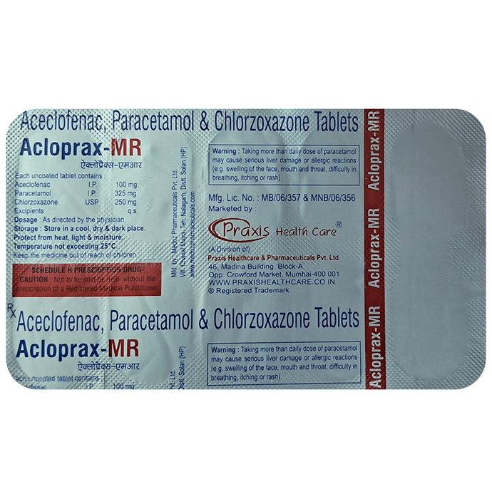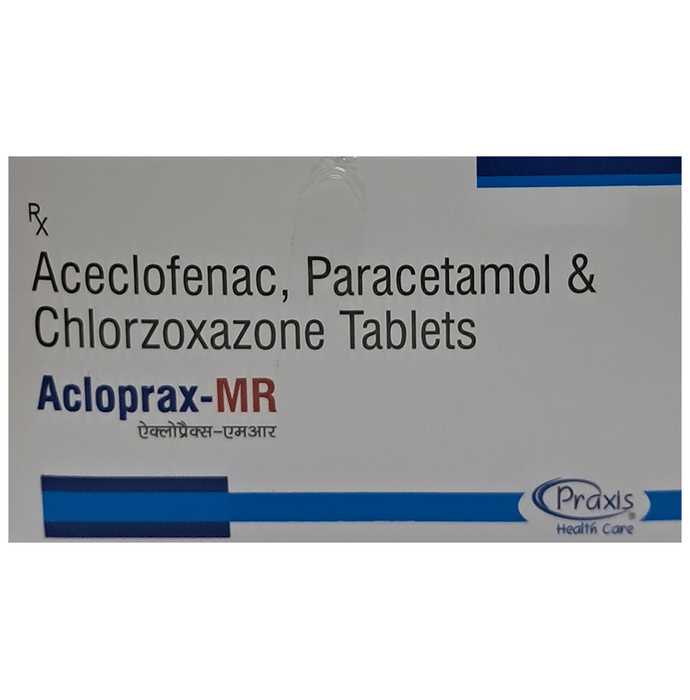 What is Acloprax-MR Tablet?::: Acloprax-MR Tablet is a combination of three medicines: Aceclofenac, Paracetamol and Chlorzoxazone. This medicine helps in relieving muscle pain by relaxing the affected muscles. It relieves pain caused due to muscle spasm, cramp or injury. It also lowers certain chemical substances in the body that cause pain.| What can I do along with Acloprax-MR Tablet to reduce muscle pain?::: If you are suffering from muscle pain due to muscle injury or overuse, you should take rest. Taking rest will help you avoid any further injury and help you recover efficiently. Make sure that you take plenty of sleep and try to reduce stress. Applying ice pack to the affected area may help in relieving pain and inflammation. If your muscle pain is due to some other disease, follow the advice of your doctor.| Can I get addicted to Acloprax-MR Tablet?::: No, there are no reports of any patient getting addicted to Acloprax-MR Tablet.| Can I stop taking Acloprax-MR Tablet when my pain is relieved?::: Acloprax-MR Tablet is usually used for short term and can be discontinued when your pain is relieved. However, Acloprax-MR Tablet should be continued if you are advised by your doctor to do so.| Can the use of Acloprax-MR Tablet cause dizziness?::: Yes, the use of Acloprax-MR Tablet can cause dizziness (feeling faint, weak, unsteady or lightheaded) in some patients. If you feel dizzy or lightheaded, it is better to rest for some time and resume once you feel better.| Can the use of Acloprax-MR Tablet cause damage to liver?::: Acloprax-MR Tablet contains Paracetamol and Chlorzoxazone, both these medicines are known to cause harm to the liver especially when taken in doses above the recommended level. Also, avoid drinking alcohol while taking this medicine, as it may further increase your risk of liver damage. Use of this medicine should preferably be avoided in patients with underlying liver disease. Contact your doctor immediately if you notice any early signs and symptoms of liver damage. These symptoms may include fever, rash, loss of appetite, nausea, vomiting, fatigue, stomach pain, dark urine, yellow skin or eyes and abnormal live enzymes.| How long will Acloprax-MR Tablet take to act?::: It may take about an hour to notice the initial benefits of pain relief after taking Acloprax-MR Tablet.| What if I forget to take Acloprax-MR Tablet?::: If you forget to take the scheduled dose of Acloprax-MR Tablet and it is almost time for your next dose, skip the dose you missed and take your next dose at the scheduled time. Otherwise, take it as soon as you remember, and then go back to taking your medicine as you would normally. Do not take a double dose to make up for the dose you missed because this may increase the risk of unwanted side effect due to overdosage. If you are not sure what to do, consult your doctor about how to manage a situation like this.| Will Acloprax-MR Tablet be more effective if taken in higher than recommended doses?::: No, taking a higher than the recommended dose may not be more effective, rather it may increase the chances of having some serious side effects and toxicity. If you experience increased severity of your symptoms that are not relieved by the recommended doses, please consult your doctor for re-evaluation.| Are there any specific contraindications associated with the use of Acloprax-MR Tablet?::: The use of Acloprax-MR Tablet is considered to be harmful in patients with known allergy to any of the components or excipients of this medicine. The use of this medicine should preferably be avoided in patients with a history of stomach ulcers or active, recurrent stomach ulcer / bleeding. It should also be avoided in patients with a history of heart failure, high blood pressure, and liver or kidney disease.| Does Acloprax-MR Tablet expire?::: Yes, Acloprax-MR Tablet does expire. Please check the expiry date written on the pack of this medicine. Do not use Acloprax-MR Tablet after the expiry date.: