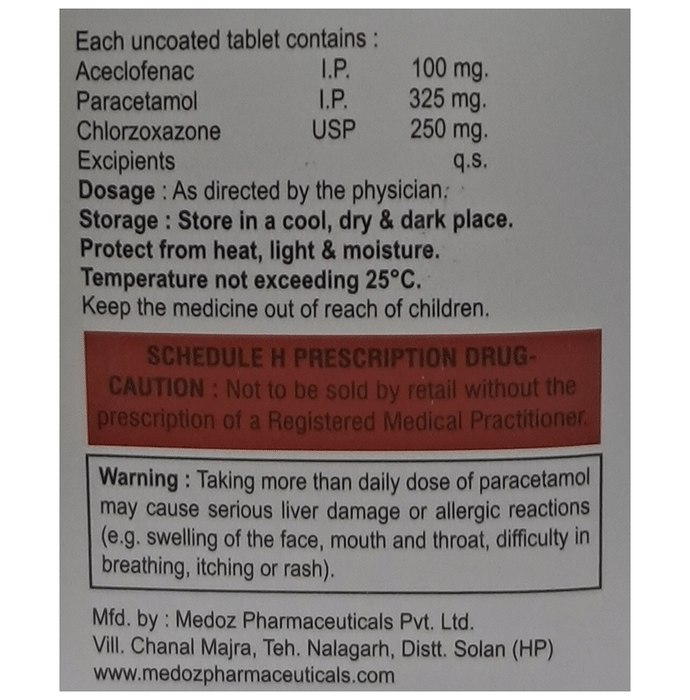 Aceclofenac (100mg) + Paracetamol (325mg) + Chlorzoxazone (250mg):<packagingdetail>:Strip: