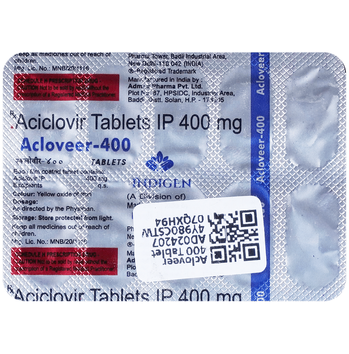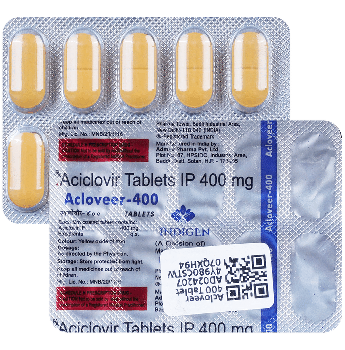 Acloveer 400 Tablet is an antiviral medicine. It helps in treating viral infections like herpes labialis, herpes simplex, shingles, genital herpes infection, and chickenpox. It prevents the multiplication of virus in human cells and therefore helps in clearing the infection. Acloveer 400 Tablet should be taken in the dose and duration as advised by your doctor. Do not skip any doses and finish the full course of treatment even if you feel better. Dissolve it in a glass of water before taking it. It may be taken with or without food, but it is better to take it at a fixed time. If you miss a dose, take it as soon as possible. However, if it is almost time for your next dose, skip the missed dose and go back to your regular schedule. Do not double the dose. You should drink plenty of water while on treatment with this medicine as it helps to prevent dehydration and kidney damage.Some side effects of this medicine include headache, dizziness, vomiting, nausea, fatigue, and fever. Inform your doctor if these side effects do not resolve or persist for a longer duration. Please consult your doctor if you are pregnant, planning to conceive or breastfeeding.