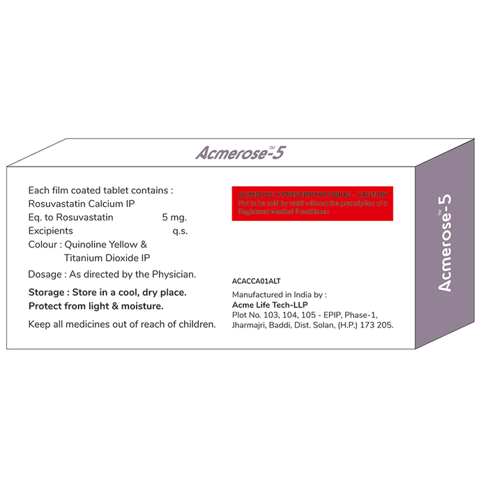 Acmerose 5 Tablet belongs to a group of medicines called statins. It is used to lower cholesterol and reduce the risk of heart disease. Cholesterol is a fatty substance that builds up in your blood vessels and causes narrowing, which may lead to a heart attack or stroke. Acmerose 5 Tablet is a widely prescribed medicine and is regarded as safe for long-term use. It can be taken with a meal or on an empty stomach. You can take it at any time of the day but try to take it at the same time each day. Most people with high cholesterol do not feel ill, but stopping your medicine may increase your cholesterol levels, making your condition worse and increasing your risk of heart disease and stroke.It is important to have your cholesterol levels checked regularly. This medicine is only one part of the treatment program which should also include a healthy diet, regular exercise, smoking cessation, moderation of alcohol intake, and weight reduction. You can eat normally while taking this medicine, but try to avoid foods that are high in fat.Common side effects of this medicine include muscle pain, weakness, nausea, headache, and stomach pain. These are usually mild and disappear after a short time. Consult your doctor if they persist or if you notice any yellowing of your eyes or get repeated or unexplained muscle pains.This medicine should not be used in conditions such as liver disease. Also, pregnant women and breastfeeding mothers should not take this medicine as it may harm the developing baby. Diabetic patients should monitor their blood sugar levels while taking this medicine, as it may lead to an increase in blood sugar levels.