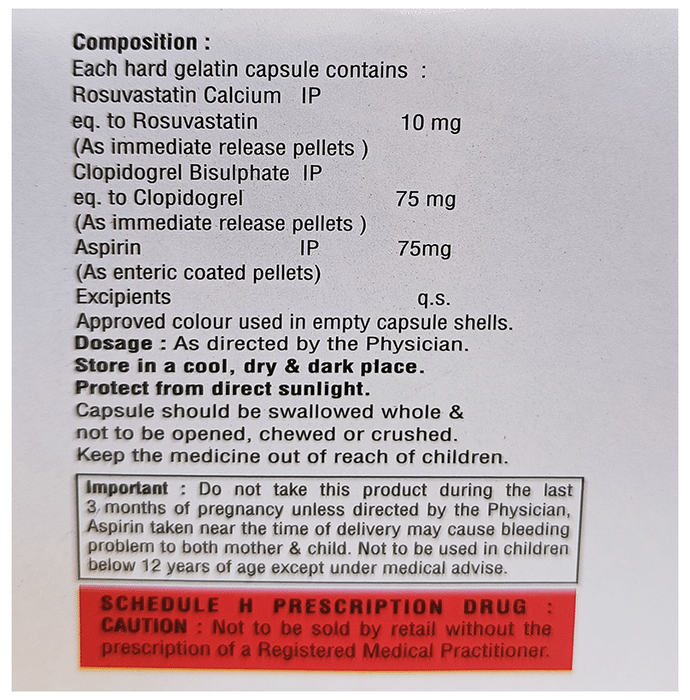 Aspirin (75mg) + Rosuvastatin (10mg) + Clopidogrel (75mg):<packagingdetail>:Strip: