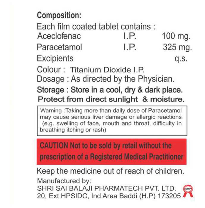 Aceclofenac (100mg) + Paracetamol (325mg):<packagingdetail>:Strip: