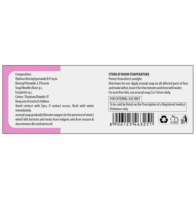 How should Acnezyl Soap be applied?::: You should remove all of the make-up. Wash your hands and the affected area and gently dry. Put a thin layer of Acnezyl Soap cream on the affected skin, using your fingertips. Apply it to the entire area affected by acne, not just each spot. After applying, wash your hands thoroughly with water.| Should Acnezyl Soap be left on overnight?::: At the beginning of the treatment, Acnezyl Soap is usually used once daily in the evening. The area is not washed off after application of Acnezyl Soap, so it can be left overnight unless you experience irritation. However, if you experience irritation, consult your doctor.| What should prompt me to discontinue Acnezyl Soap?::: You should discontinue Acnezyl Soap and consult your doctor if you experience severe local irritation, which means severe redness, dryness and itching and stinging/burning sensation. | What precautions should be followed while applying Acnezyl Soap?::: Use Acnezyl Soap only on your skin. Keep it away from areas like your eyes, eyelids, lips, mouth and inside of the nose. If the medicine comes in contact with any of these areas, wash the affected area with water immediately. Avoid using Acnezyl Soap on scratched or eroded skin and open wounds. Take care when using Acnezyl Soap on sensitive areas of skin such as your neck. Acnezyl Soap can make your skin more sensitive to the harmful effects of the sunlight. So, avoid the use of sunbeds/lamps and minimize the time you spend in the sun. You should use sunscreen and wear protective clothing while using Acnezyl Soap. Avoid contact with hair as Acnezyl Soap has bleaching properties. It can even bleach dyed or colored fabric, furniture or carpeting.| How often should I apply Acnezyl Soap?::: The initial dose is preferably once daily in the evening. Later, the doctor will gradually increase the dose to twice daily (most probably morning and evening).| How long does Acnezyl Soap take to show its effects?::: You may see an improvement after 4-6 weeks of treatment. You may need to use this treatment for longer to see the full benefits. This is normal for acne treatments. If your acne does not get better after 1 month or if it gets worse, talk to your doctor immediately.| Do you apply moisturizer before or after Acnezyl Soap?::: You may apply moisturizer an hour after applying Acnezyl Soap. Consult your doctor in case of any doubt or concern.: