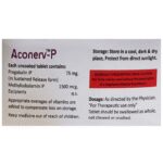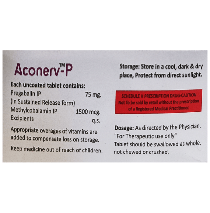 What is Aconerv-P Tablet SR?::: Aconerv-P Tablet SR is a combination of two medicines: Pregabalin and Methylcobalamin. This medicine is useful in the treatment of nerve pain (neuropathic pain). It calms the damaged or overactive nerves by acting on the brain, thereby decreasing the pain sensation. It also helps in the regeneration of damaged nerves in the body.| Can I stop taking Aconerv-P Tablet SR when my pain is relieved?::: No, you should not stop taking Aconerv-P Tablet SR even if your pain is relieved. Continue to take it as advised by your doctor. If you suddenly stop taking Aconerv-P Tablet SR, you may experience withdrawal symptoms such as anxiety, sleeping difficulties, nausea, pain and sweating. You may need to gradually taper the use of Aconerv-P Tablet SR before you stop the medication completely.| How to manage weight gain associated with the use of Aconerv-P Tablet SR?::: Aconerv-P Tablet SR can make you feel hungry which might make you eat more, thereby increasing your chances of putting on weight. However, preventing weight gain is easier than losing the increased weight. Try to eat a healthy balanced diet without increasing your portion sizes (per-meal intake). Do not eat food items that contain a lot of calories, such as soft drinks, oily food, chips, cakes, biscuits, and sweets. If you feel hungry between meals, avoid eating junk food and eat fruits, vegetables and low-calorie foods. Regular exercise will help prevent weight gain. If you maintain good eating habits and exercise regularly, you might not gain any weight.| Can the use of Aconerv-P Tablet SR cause sleepiness or drowsiness?::: Yes, Aconerv-P Tablet SR may make you feel drowsy or you may suddenly fall asleep during your daily activities. Sometimes, you might not even feel drowsy or have any other warning signs before you suddenly fall asleep. Avoid driving a car, operating machinery, working at heights or participating in potentially dangerous activities at the beginning of your treatment until you know how the medicine affects you. Inform your doctor if you experience such episodes while you are taking this medicine.| Are there any serious side effects associated with the use of Aconerv-P Tablet SR?::: Serious side effects caused because of the use of Aconerv-P Tablet SR are uncommon and rare. However, it may cause serious side effects like allergic reaction, suicidal thoughts or swelling of limbs (hands, legs or feet). Stop taking Aconerv-P Tablet SR and contact your doctor if you have any signs of these serious side effects. Signs of an allergic reaction include swelling of your face, mouth, lips, gums, tongue and neck. Allergic reactions can also lead to trouble in breathing, skin rash, hives (raised bumps) or blisters. Pay attention to any changes, especially sudden changes in mood, behaviors, thoughts or feelings, or if you have suicidal thoughts.| How long will the Aconerv-P Tablet SR take to act?::: An initial benefit with Aconerv-P Tablet SR may be seen after 2 weeks of treatment. However, it may take around 2-3 months or more (in some patients) to see the full benefits.| What if I forget to take Aconerv-P Tablet SR?::: If you forget to take the scheduled dose of Aconerv-P Tablet SR and it is almost time for your next dose, skip the dose you missed and take your next dose at the scheduled time. Otherwise, take it as soon as you remember, and then go back to taking your medicine as you would normally. Do not take a double dose to make up for the dose you missed because this may increase the risk of unwanted side effects. If you are not sure what to do, consult your doctor about how to manage a situation like this.| Will a higher than the recommended dose of Aconerv-P Tablet SR be more effective?::: No, taking a higher than the recommended dose may not be more effective, rather it may increase the chances of having some serious side effects and toxicity. If you experience increased severity of your symptoms that are not relieved by the recommended doses, please consult your doctor for re-evaluation.| Can I drink alcohol while taking Aconerv-P Tablet SR?::: No, do not drink alcohol while taking Aconerv-P Tablet SR. Drinking alcohol can increase the severity of drowsiness or sleepiness caused by Aconerv-P Tablet SR.| How often should I see the doctor ?::: You may need to see your doctor regularly if you have started to take Aconerv-P Tablet SR. However, you must consult your doctor if the advised dosage of Aconerv-P Tablet SR does not improve your symptoms or you continue experiencing some unwanted side effects that affect your routine activities.| Are there any special instructions regarding storage and disposal of this medicine?::: Keep your tablets in the pack until it is time to take them. Store them in a cool dry place. Store them out of sight and reach of children. Unused medications should be disposed of in special ways to ensure that pets, children and other people cannot consume them.: