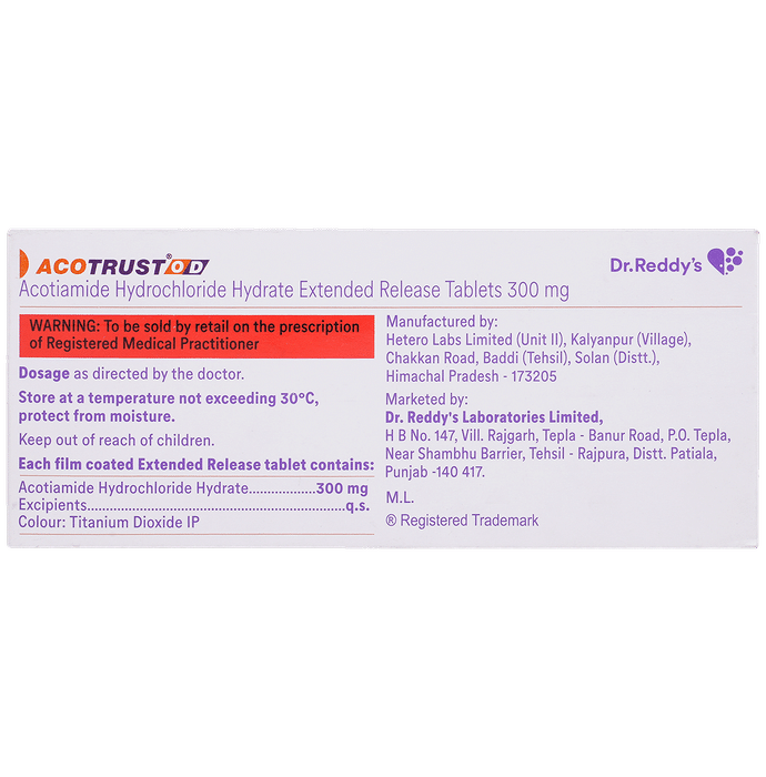 What is Acotrust OD 300mg Tablet ER used for?::: Acotrust OD 300mg Tablet ER is used in the treatment of functional dyspepsia. It helps to relieve the symptoms like bloating after a meal, pain/discomfort in the upper abdomen and early satiety (feeling of fullness in a short span of time after having only little food).| When should I take Acotrust OD 300mg Tablet ER?::: Acotrust OD 300mg Tablet ER should be taken before meals. Always complete the prescribed course of treatment as advised by your doctor even if you start to feel better.| Is Acotrust OD 300mg Tablet ER effective?::: Acotrust OD 300mg Tablet ER is effective if used in the dose and duration advised by your doctor. Do not stop taking it even if you see improvement in your condition. If you stop using Acotrust OD 300mg Tablet ER too early, the symptoms may return or worsen.| Can I stop taking Acotrust OD 300mg Tablet ER when I feel better?::: No, do not stop taking Acotrust OD 300mg Tablet ER without consulting your doctor even if you are feeling better. Your symptoms may improve before the condition is completely cured. Therefore, for better and complete treatment, it is advised to continue your treatment for the prescribed duration.| Is Acotrust OD 300mg Tablet ER safe?::: Acotrust OD 300mg Tablet ER is safe if used in the dose and duration advised by your doctor. Take it exactly as directed and do not skip any dose. Follow your doctor’s instructions carefully and let your doctor know if any of the side effects bother you.| Can dyspepsia be cured?::: No, functional dyspepsia cannot be cured completely. But, the symptoms of functional dyspepsia such as bloating after a meal, pain/discomfort in the upper abdomen and early satiety (feeling of fullness in a short span of time after having only little food), can be effectively managed with medicines as well as a few lifestyle changes. Practise yoga or meditation or take up a hobby. Ensure that you have a sound sleep every night as this also reduces your stress and hence helps in keeping your symptoms well-controlled. Try to eat smaller, frequent meals and avoid eating late at night. There should be a gap of at least 3 to 4 hours between dinner and going to bed at night. Take more fiber-rich foods such as fresh fruits, vegetables and avoid spicy or oily foods. Reducing weight can also help if you are obese. These simple life-hacks can help you manage your condition a lot.: