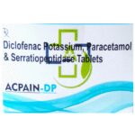 What are the storage condition for Acpain DP 50mg/325mg/15mg Tablet?::: Keep this medicine in the container or the pack it came in, tightly closed. Store it as mentioned on the pack or label. Dispose of the unused medicine. Make sure it is not consumed by pets, children and other people.| What is Acpain DP 50mg/325mg/15mg Tablet?::: Acpain DP 50mg/325mg/15mg Tablet is a combination of three medicines: Diclofenac, Paracetamol, and Serratiopeptidase. This medication helps in relieving pain and inflammation. It works by lowering the levels of chemical substances in the body that causes pain and inflammation.| Is it safe to use Acpain DP 50mg/325mg/15mg Tablet?::: Yes, Acpain DP 50mg/325mg/15mg Tablet is safe for most of the patients, however, in some patients it may cause common unwanted side effects like nausea, vomiting, stomach pain, heartburn and diarrhea. Inform your doctor as soon as possible if you experience any persistent problem due to the medication.| Can I stop taking Acpain DP 50mg/325mg/15mg Tablet when my pain is relieved?::: Acpain DP 50mg/325mg/15mg Tablet is usually used for a short term and can be discontinued when the pain is relieved. However, Acpain DP 50mg/325mg/15mg Tablet should be continued if you are advised by your physician to do so.| Can the use of Acpain DP 50mg/325mg/15mg Tablet cause nausea and vomiting?::: Yes, the use of Acpain DP 50mg/325mg/15mg Tablet can cause nausea and vomiting.Taking it with milk, food or with antacids can prevent nausea. Avoid taking fatty or fried foods along with this medication. In case of vomiting, drink plenty of water or other fluids by taking small frequent sips. Talk to your doctor if vomiting persists and you notice signs of dehydration, like dark colored and strong-smelling urine and a low frequency of urination. Do not take any other medicine without speaking to your doctor.| Can the use of Acpain DP 50mg/325mg/15mg Tablet cause dizziness?::: Yes, the use of $ame can cause dizziness (feeling faint, weak, unsteady or lightheaded) in some patients. If you feel dizzy or lightheaded, it is better to rest for sometime and resume once you feel better. Do not drive or use any machines.| Are there any specific contraindications associated with the use of Acpain DP 50mg/325mg/15mg Tablet?::: The use of Acpain DP 50mg/325mg/15mg Tablet is considered to be harmful for patients with known allergy to any of the components or excipients of this medicine or in patients with known allergy to other painkillers (NSAIDs). The use of this medicine should preferably be avoided in patients with a history of stomach ulcers or in patients with active, recurrent stomach ulcer/bleeding. It should also be avoided in patients with a history of heart failure, high blood pressure, and liver or kidney disease.| Can I take Acpain DP 50mg/325mg/15mg Tablet with Vitamin B-complex?::: Acpain DP 50mg/325mg/15mg Tablet can be taken with Vitamin B-complex preparations. While Acpain DP 50mg/325mg/15mg Tablet helps to relieve pain, Vitamin B-complex can help to correct the vitamin deficiency that might be causing your symptoms.| Can I take Acpain DP 50mg/325mg/15mg Tablet for stomach pain?::: No, Acpain DP 50mg/325mg/15mg Tablet preferably should not be taken for stomach pain without consulting a physician. This drug can increase stomach acid secretion which may aggravate an unknown underlying condition.| Can the use of Acpain DP 50mg/325mg/15mg Tablet cause damage to kidneys?::: No, taking higher than the recommended dose of Acpain DP 50mg/325mg/15mg Tablet can lead to increased chances of side effects. If you are experiencing increased severity of pain or if the pain is not relieved by the recommended doses, please consult your doctor for re-evaluation.: