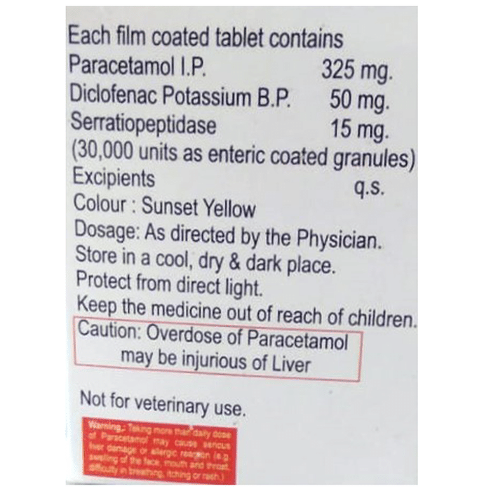 Diclofenac (50mg) + Paracetamol (325mg) + Serratiopeptidase (15mg):<packagingdetail>:Strip: