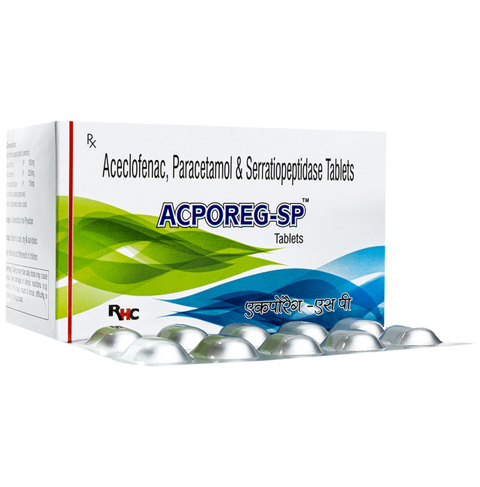 What is Acporeg-SP Tablet?::: It is a combination of three medicines: Aceclofenac, Paracetamol, and Serratiopeptidase. This medication helps in relieving pain and inflammation. It works by lowering the levels of chemical substances in the body that cause pain and inflammation.| Is it safe to take Acporeg-SP Tablet?::: It is safe to take this medicine for most of the patients. However, in some patients, it may cause unwanted side effects like nausea, vomiting, stomach pain, heartburn, and diarrhea. If you experience any persistent problem due to the medication, inform your doctor as soon as possible.| Can I stop taking Acporeg-SP Tablet when my pain is relieved?::: This medicine is usually used for the short term and can be discontinued when your pain is relieved. However, continued taking it if your doctor has advised you to do so.| Can Acporeg-SP Tablet cause nausea and vomiting?::: Yes, the use of this medicine can cause nausea and vomiting. In case you experience nausea while taking this medicine, take it with milk, food, or with antacids. Avoid taking fatty or fried foods along with this medication. In case of vomiting, drink plenty of water or other fluids by taking small frequent sips. Talk to your doctor if vomiting persists and you notice signs of dehydration, like dark colored and strong-smelling urine and a low frequency of urination. Do not take any other medicines without speaking to your doctor.| Can Acporeg-SP Tablet cause dizziness?::: Yes, the use of this medicine can cause dizziness (feeling faint, weak, unsteady or lightheaded) in some patients. If you feel dizzy or lightheaded, it is better to rest for sometime and resume once you feel better.| Are there any specific contraindications associated with taking Acporeg-SP Tablet?::: The use of this medicine is considered harmful for patients with known allergy to any of the components or excipients of this medicine or in patients with known allergy to other painkillers (NSAIDs). Its use should preferably be avoided in patients with a history of stomach ulcers or in patients with active, recurrent stomach ulcers/bleeding. It should also be avoided in patients with a history of heart failure, high blood pressure, and liver or kidney disease.| Can I take Acporeg-SP Tablet with vitamin B-complex?::: Yes, this medicine can be taken with vitamin B-complex preparations. While it helps to relieve pain, vitamin B-complex can help to correct the vitamin deficiency that might be causing your symptoms.| Can the use of Acporeg-SP Tablet cause damage to kidneys?::: Yes, long-term use of this medicine can cause damage to the kidneys. Normal kidneys produce a chemical called prostaglandins that protect them from damage. The use of painkillers lowers the levels of prostaglandins in the body, which leads to kidney damage on long-term use. The use of painkillers is not recommended in patients with underlying kidney disease.| Can I take a higher dose of Acporeg-SP Tablet than recommended?::: No, taking a higher than recommended dose can lead to increased chances of side effects. If you are experiencing increased severity of pain or the pain is not relieved by the recommended doses, please consult your doctor for re-evaluation.| What are the instructions for storage and disposal of Acporeg-SP Tablet?::: Keep this medicine in the packet or the container it came in, tightly closed. Store it according to the instructions mentioned on the pack or label. Dispose of the unused medicine. Make sure it is not consumed by pets, children and other people.: