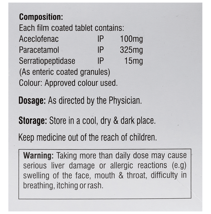 Aceclofenac (100mg) + Paracetamol (325mg) + Serratiopeptidase (15mg):<packagingdetail>:Strip: