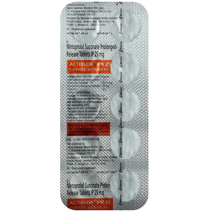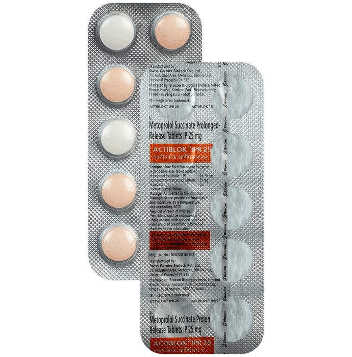 How long does Actiblok IPR 25 Tablet take to work?::: The time taken by Actiblok IPR 25 Tablet to start working varies from person to person. Usually, Actiblok IPR 25 Tablet starts working within 15 minutes. However, in some patients, it may take up to 2 hours to start working. It starts acting slowly and the maximum or full effect is usually experienced within a span of 1 week. In case you do not feel any difference while taking Actiblok IPR 25 Tablet, do not panic. The medicine exerts its beneficial effects when taken for a long time.| Is taking Actiblok IPR 25 Tablet dangerous?::: Actiblok IPR 25 Tablet is usually safe when taken as per the doctor’s prescription. This medicine exhibits dangerous effects if the medicine is stopped suddenly. Stopping the medicine suddenly can cause an abrupt increase in the heart rate and affect its activity, which can be dangerous for heart failure patients and can even lead to a heart attack in some patients. So, do not stop the medicine suddenly and take it for the prescribed duration.| Does Actiblok IPR 25 Tablet help you sleep better?::: Actiblok IPR 25 Tablet belongs to the beta-blockers class of medicine. Though their effect on sleep varies from person to person, it has been found that these medicines are known to alter the sleep pattern and disturb sleep in few patients. On the other hand, it has also been seen to promote better sleep in patients with increased heart rate and anxiety by calming down the heart and nerves. Do consult your doctor in case you have any sleep disturbances.| Can I take alcohol after taking Actiblok IPR 25 Tablet?::: No, you should not consume alcohol after taking Actiblok IPR 25 Tablet. Alcohol may increase the blood-pressure-lowering effects of this medicine and lead to low blood pressure.: