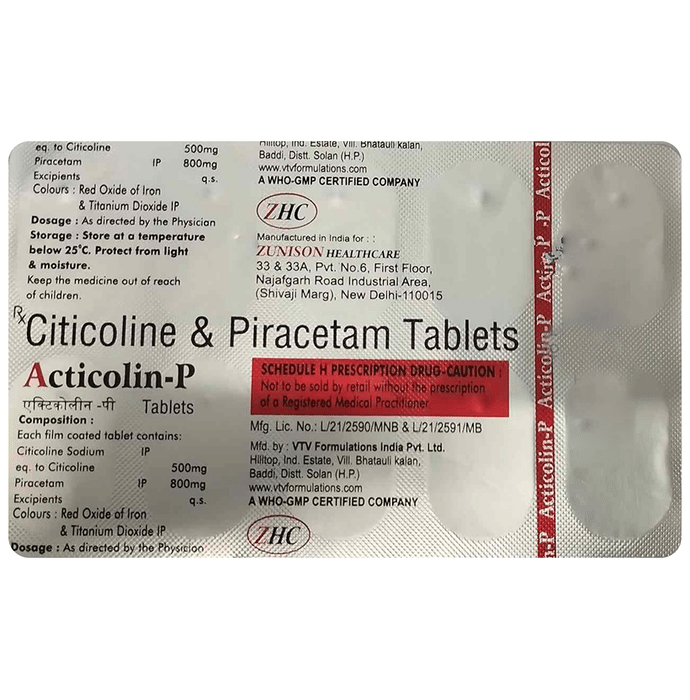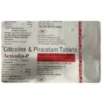 Acticolin P Tablet is a medicine used in stroke rehabilitation and as a cognitive enhancer. It protects the nerve cells in the brain from damage and also helps to repair the damaged nerve cells. It may also be used in the treatment of brain trauma. Acticolin P Tablet may be taken with or without food, preferably at the same time each day. Take it at the same time each day as this helps to maintain a consistent level of medicine in the body. Take this medicine in the dose and duration as advised by your doctor and if you have missed a dose, take it as soon as you remember it. Do not skip any doses and finish the full course of treatment even if you feel better. It is important that this medication is not stopped suddenly without talking to your doctor as it may worsen your symptoms.Some common side effects of this medicine include hyperactivity, stomach pain, nervousness, and decreased blood pressure. However, these are temporary and usually resolve on their own. Please consult your doctor if these do not subside or bother you. Drink plenty of fluids to keep yourself hydrated while taking this medicine as this medicine may cause diarrhea. This medicine may cause weight gain and to control it, you should have a balanced diet and exercise regularly.
