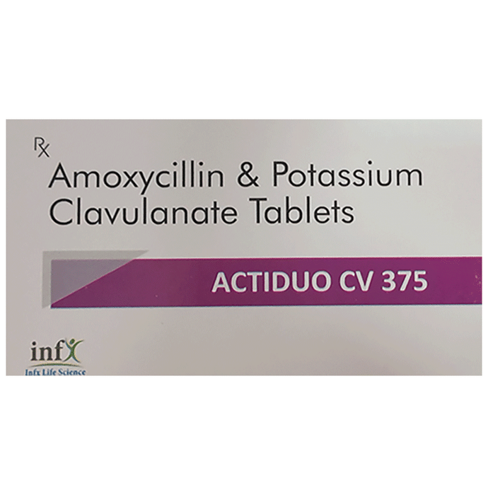 What is Actiduo CV 375 Tablet?::: Actiduo CV 375 Tablet is a combination of two medicines: Amoxycillin and Clavulanic acid. It is used to treat bacterial infections like, tonsillitis, sinusitis, otitis media, respiratory tract infections, urinary tract infections, boils, abscesses, cellulitis, wound infection, bone infection, and oral cavity infections. The medicine works by killing the harmful bacteria that cause infections.| Is it safe to use Actiduo CV 375 Tablet?::: Actiduo CV 375 Tablet is safe to use when taken as advised by the doctor. However, in some patients, it may cause common side effects like diarrhea, nausea, vomiting, rash, allergic reaction and other uncommon or rare side effects. If you experience any persistent problem during the course of your treatment, inform your doctor as soon as possible.| Are there any specific cautions associated with the use of Actiduo CV 375 Tablet?::: The use of Actiduo CV 375 Tablet is considered to be harmful for patients with known allergy to penicillins or any other ingredient of the medicine. It should not be used in patients with a history of liver disease. Therefore, inform your doctor if you are allergic to any medicines.| Can the use of Actiduo CV 375 Tablet cause contraceptive failure?::: Yes, the use of Actiduo CV 375 Tablet can lower the efficacy of birth control pills. Consult your doctor and seek advice regarding the use of other methods of contraception (e.g., condom, diaphragm, spermicide) while you are taking Actiduo CV 375 Tablet.| Can I take a higher than the recommended dose of Actiduo CV 375 Tablet?::: No, taking a higher than the recommended dose of Actiduo CV 375 Tablet can increase the risks of side effects. Actiduo CV 375 Tablet takes time to show its full effect and treat your infection. If you are experiencing increased severity of your symptoms, please consult your doctor for re-evaluation.| What are the instructions for the storage and disposal of Actiduo CV 375 Tablet?::: Keep this medicine in the container or the pack it came in, tightly closed. Store it according to the instructions mentioned on the pack or label. Dispose off the unused medicine. Make sure it is not consumed by pets, children and other people.| Can I stop taking Actiduo CV 375 Tablet when my symptoms are relieved?::: No, do not stop taking Actiduo CV 375 Tablet before completing the full course of the treatment, even if you feel better. Your symptoms may improve before the infection is completely cured. Hence, continue taking the medicine for the due course as the medicine may still be showing beneficial effects.| Can Actiduo CV 375 Tablet cause an allergic reaction?::: Yes, Actiduo CV 375 Tablet can cause an allergic reaction. It is considered to be harmful for patients with known allergy to penicillins. Get emergency medical help if you have any signs of allergic reaction like hives, difficulty breathing, or swelling of your face, lips, tongue or throat.| Can the use of Actiduo CV 375 Tablet cause diarrhea?::: Yes, the use of Actiduo CV 375 Tablet can cause diarrhea. It is an antibiotic which kills the harmful bacteria. In addition to that, the medicine may affect the helpful bacteria in your stomach or intestine as well and cause diarrhea. In case you experience diarrhea, drink plenty of water or other fluids. Talk to your doctor if diarrhea persists and you notice any signs of dehydration, like less frequency of urination with dark colored and strong-smelling urine. Do not take any other medicine without consulting a doctor.| Can I take Actiduo CV 375 Tablet to treat cold and flu?::: No, Actiduo CV 375 Tablet does not treat a viral infection like the common cold or flu. Consult your doctor and avoid self-medication. | Will Actiduo CV 375 Tablet cause drowsiness?::: No Actiduo CV 375 Tablet does not cause drowsiness. If you experience any such effects, consult your doctor.: