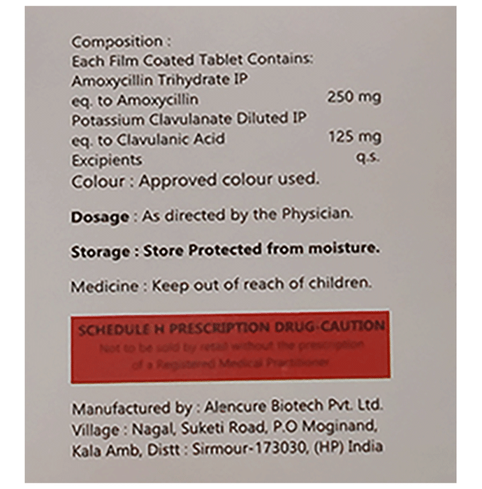 Amoxycillin (250mg) + Clavulanic Acid (125mg):<packagingdetail>:Strip: