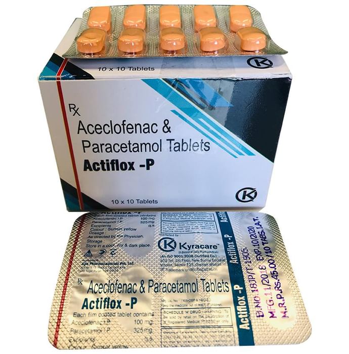 What is Actiflox-P Tablet?::: Actiflox-P Tablet is a combination of two medicines: Aceclofenac and Paracetamol. This medication helps in relieving pain and inflammation. It works by lowering the levels of chemical substances in the body that cause pain and inflammation.| Is it safe to use Actiflox-P Tablet?::: Actiflox-P Tablet is safe for most of the patients. However, in some patients it may cause some unwanted common side effects like nausea, vomiting, stomach pain, heartburn, diarrhea and other uncommon and rare side effects.| Can I stop taking Actiflox-P Tablet when my pain is relieved?::: If you are using the medication for a condition associated with long-term pain then Actiflox-P Tablet should be continued for as long as advised by your physician. It can be discontinued if you are using it for short-term pain relief.| Can the use of Actiflox-P Tablet cause nausea and vomiting?::: Yes, the use of Actiflox-P Tablet can cause nausea and vomiting. Taking it with milk, food or with antacids can prevent nausea. Avoid taking fatty or fried foods along with this medication. In case of vomiting drink plenty of water or other fluids by taking small frequent sips. Talk to your doctor if vomiting persists and you notice signs of dehydration, like dark colored and strong-smelling urine and a low frequency of urination. Do not take any other medicine without speaking to your doctor.| Can the use of Actiflox-P Tablet cause dizziness?::: Yes, the use of Actiflox-P Tablet can cause dizziness (feeling faint, weak, unsteady or lightheaded) in some patients. If you feel dizzy or lightheaded, it is better to rest for sometime and resume once you feel better.| Are there any specific contraindications associated with the use of Actiflox-P Tablet?::: The use of Actiflox-P Tablet is considered to be harmful for patients with known allergy to any of the components or excipients of this medicine or in patients with known allergy to other painkillers (NSAIDs). It should preferably be avoided in patients with a history of stomach ulcers or in patients with active, recurrent stomach ulcer/bleeding. It should also be avoided in patients with a history of heart failure, high blood pressure, and liver or kidney disease.| Can Actiflox-P Tablet be taken with vitamin B-complex?::: Yes, Actiflox-P Tablet can be taken with vitamin B-complex preparations. While Actiflox-P Tablet helps to relieve pain, vitamin B-complex can help to correct the vitamin deficiency that might be causing the underlying painful condition.| Is Actiflox-P Tablet helpful in relieving stomach pain?::: No, Actiflox-P Tablet preferably should not be taken for stomach pain without consulting a physician. This drug can increase stomach acid secretion which may aggravate an unknown underlying condition.| Can the use of Actiflox-P Tablet cause damage to kidneys?::: Yes, the long-term use of Actiflox-P Tablet can cause damage to the kidneys. Normal kidneys produce a chemical messenger called prostaglandins that protects them from damage. Use of painkillers lowers the levels of prostaglandins in the body which leads to kidney damage on long-term use. Use of painkillers is not recommended to patients with underlying kidney disease.| Is it safe to take a higher dose of Actiflox-P Tablet than recommended?::: No, taking higher than the recommended dose of Actiflox-P Tablet can lead to increased chances of side effects like nausea, vomiting, heartburn, indigestion, diarrhea and can also damage your kidneys on long-term use. If you are experiencing increased severity of pain or if the pain is not relieved by the recommended doses of this medicine, please consult your doctor for re-evaluation.| What are the instructions for storage and disposal of Actiflox-P Tablet?::: Keep this medicine in the container or the pack it came in, tightly closed. Store it according to the instructions mentioned on the pack or label. Dispose of the unused medicine. Make sure it is not consumed by pets, children and other people.| How long does it take for Actiflox-P Tablet to show results?::: The effect of Actiflox-P Tablet can be seen within 1.5 to 3 hours of oral administration of the medicine and the time taken to show the desired effects may vary with every individual patient.| What is the dosage of Actiflox-P Tablet?::: You may take one tablet of Actiflox-P Tablet twice daily or as prescribed by your doctor. Always follow your doctor’s instructions while taking this medicine.| Can I take Actiflox-P Tablet along with other painkiller tablets?::: No, it is not recommended to take Actiflox-P Tablet with other painkiller medicines without consulting your doctor since it may cause unwanted side effects like stomach pain or ulcers.| Can Actiflox-P Tablet be given to children?::: No, Actiflox-P Tablet is not recommended for use in children under the age of 18 years.: