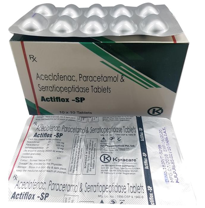 What is Actiflox-SP Tablet?::: It is a combination of three medicines: Aceclofenac, Paracetamol, and Serratiopeptidase. This medication helps in relieving pain and inflammation. It works by lowering the levels of chemical substances in the body that cause pain and inflammation.| Is it safe to take Actiflox-SP Tablet?::: It is safe to take this medicine for most of the patients. However, in some patients, it may cause unwanted side effects like nausea, vomiting, stomach pain, heartburn, and diarrhea. If you experience any persistent problem due to the medication, inform your doctor as soon as possible.| Can I stop taking Actiflox-SP Tablet when my pain is relieved?::: This medicine is usually used for the short term and can be discontinued when your pain is relieved. However, continued taking it if your doctor has advised you to do so.| Can Actiflox-SP Tablet cause nausea and vomiting?::: Yes, the use of this medicine can cause nausea and vomiting. In case you experience nausea while taking this medicine, take it with milk, food, or with antacids. Avoid taking fatty or fried foods along with this medication. In case of vomiting, drink plenty of water or other fluids by taking small frequent sips. Talk to your doctor if vomiting persists and you notice signs of dehydration, like dark colored and strong-smelling urine and a low frequency of urination. Do not take any other medicines without speaking to your doctor.| Can Actiflox-SP Tablet cause dizziness?::: Yes, the use of this medicine can cause dizziness (feeling faint, weak, unsteady or lightheaded) in some patients. If you feel dizzy or lightheaded, it is better to rest for sometime and resume once you feel better.| Are there any specific contraindications associated with taking Actiflox-SP Tablet?::: The use of this medicine is considered harmful for patients with known allergy to any of the components or excipients of this medicine or in patients with known allergy to other painkillers (NSAIDs). Its use should preferably be avoided in patients with a history of stomach ulcers or in patients with active, recurrent stomach ulcers/bleeding. It should also be avoided in patients with a history of heart failure, high blood pressure, and liver or kidney disease.| Can I take Actiflox-SP Tablet with vitamin B-complex?::: Yes, this medicine can be taken with vitamin B-complex preparations. While it helps to relieve pain, vitamin B-complex can help to correct the vitamin deficiency that might be causing your symptoms.| Can the use of Actiflox-SP Tablet cause damage to kidneys?::: Yes, long-term use of this medicine can cause damage to the kidneys. Normal kidneys produce a chemical called prostaglandins that protect them from damage. The use of painkillers lowers the levels of prostaglandins in the body, which leads to kidney damage on long-term use. The use of painkillers is not recommended in patients with underlying kidney disease.| Can I take a higher dose of Actiflox-SP Tablet than recommended?::: No, taking a higher than recommended dose can lead to increased chances of side effects. If you are experiencing increased severity of pain or the pain is not relieved by the recommended doses, please consult your doctor for re-evaluation.| What are the instructions for storage and disposal of Actiflox-SP Tablet?::: Keep this medicine in the packet or the container it came in, tightly closed. Store it according to the instructions mentioned on the pack or label. Dispose of the unused medicine. Make sure it is not consumed by pets, children and other people.: