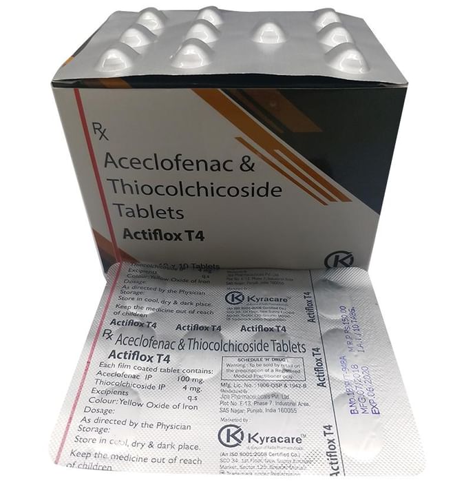 What is Actiflox T 4 Tablet?::: Actiflox T 4 Tablet is a combination of two medicines: Aceclofenac and Thiocolchicoside. This medication helps in relieving muscle pain. It relaxes the muscles by acting on the central nervous system and lowering chemical substance in the body that cause pain and inflammation.| Is it safe to use Actiflox T 4 Tablet?::: Yes, Actiflox T 4 Tablet is safe for most of the patients. However, in some patients it may cause some common unwanted side effects like nausea, vomiting, stomach pain, heartburn, diarrhoea and other uncommon and rare side effects. Inform your doctor if you experience any persistent problem due to the medication.| Can the Actiflox T 4 Tablet be stopped when my pain is relieved?::: Actiflox T 4 Tablet is usually used for short term and can be discontinued when the pain is relieved. However, Actiflox T 4 Tablet should be continued if your doctor has advised you to do so.| Can the use of Actiflox T 4 Tablet cause dizziness?::: Yes, the use of Actiflox T 4 Tablet can cause dizziness (feeling faint, weak, unsteady or lightheaded) in some patients. If you feel dizzy or lightheaded, it is better to rest for some time and resume once you feel better.| Are there any specific contraindications associated with the use of Actiflox T 4 Tablet?::: The use of Actiflox T 4 Tablet is considered to be harmful for patients with known allergy to painkillers or any of the components or excipients of this medicine. The use of this medicine should preferably be avoided in patients with a history of stomach ulcer or in patients with active, recurrent stomach ulcer/bleeding. It should also be avoided in patients with history of heart failure, high blood pressure, and liver or kidney disease.| Can Actiflox T 4 Tablet be taken with Vitamin B-complex?::: Yes, Actiflox T 4 Tablet can be taken with Vitamin B-complex preparations. While Actiflox T 4 Tablet helps to relieve pain, Vitamin B-complex can help to correct the vitamin deficiency that might be causing your symptoms.| Can the use of Actiflox T 4 Tablet cause damage to kidneys?::: Yes, the long-term use of Actiflox T 4 Tablet can cause damage to the kidneys. Normal kidneys produce a chemical called prostaglandins that protects them from damage. Use of painkillers lower the levels of prostaglandins in the body which leads to kidney damage on long-term use. Use of painkillers is not recommended in patients with underlying kidney disease.| Will Actiflox T 4 Tablet be more effective if taken in higher doses?::: No, taking more of this medicine will not make it more effective, rather it can lead to increased side effects. If the symptoms are getting severe, please consult the doctor for re-evaluation.: