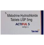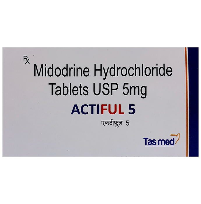Does Actiful 5 Tablet raise blood pressure?::: Yes, Actiful 5 Tablet may cause high blood pressure when you are lying flat on your back (supine hypertension). This medicine should only be used by people whose low blood pressure affects their day-to-day life and in people who could not be treated successfully with other therapies.| Does Actiful 5 Tablet affect heart rate?::: Actiful 5 Tablet may slow down the heart rate slightly. It should be used cautiously when using it with other medicines (beta blockers, digitalis, etc.) which can further slow down the heart rate. Patients should be monitored if they experience symptoms which are suggestive of slow heart rate.| Why can’t I lie down after taking Actiful 5 Tablet?::: You should not lie down immediately after taking Actiful 5 Tablet because of the risk of supine hypertension (high blood pressure which occurs when you are lying flat on your back). Therefore, it is recommended to take the last daily dose at least 4 hours before bedtime. You can reduce the risk of supine hypertension occurring during the night by elevating the head.| Does Actiful 5 Tablet work immediately?::: Actiful 5 Tablet takes about 1 hour to show its effects. However, the action lasts for a short time only, the effect persists for about 2-3 hours.| How do I take Actiful 5 Tablet?::: Actiful 5 Tablet should be taken exactly as directed by your doctor. Actiful 5 Tablet is taken orally with or without food. Swallow the tablet as a whole with a glass of water. Usually, it is advised to take the medicine three times a day (morning, midday, and late afternoon [before 6PM]) with a gap of at least 3 hours. Take the last daily dose of Actiful 5 Tablet before an evening meal and at least 4 hours before bedtime.| Who should not take Actiful 5 Tablet?::: Actiful 5 Tablet is not advised for patients having allergy to any component of the product, severe heart disease, unusually slow heart rate, high blood pressure, and conditions causing tightening of the arteries. Along with that, treatment with Actiful 5 Tablet should be avoided if the patient has enlarged prostate gland, urinary retention (when the bladder can’t empty properly), pheochromocytoma (tumour of the adrenal medulla), acute or severe kidney disease, overactive thyroid, poor vision as a result of diabetes, and narrow-angle glaucoma (elevated pressure in the eye).| Is any monitoring required during Actiful 5 Tablet treatment?::: You may need to check your blood pressure and get your kidney and liver function tests done before you start taking Actiful 5 Tablet. Once you begin the treatment, keep a constant track of your blood pressure and heart rate, especially after lying down.| How will I know that I have developed supine hypertension?::: Symptoms of supine hypertension include chest pain, palpitations, shortness of breath, headache, and blurred vision. If you develop these symptoms tell your doctor immediately. The doctor may reduce the dose of Actiful 5 Tablet or may discontinue treatment if the symptoms persists.| Can I take metoprolol with Actiful 5 Tablet?::: Using Actiful 5 Tablet and metoprolol together can make your heart rate considerably slow. Hence, you need to be careful while using both together. If you experience slow pulse, dizziness and fainting, inform your doctor as the dose of these medicines may need to be modified.: