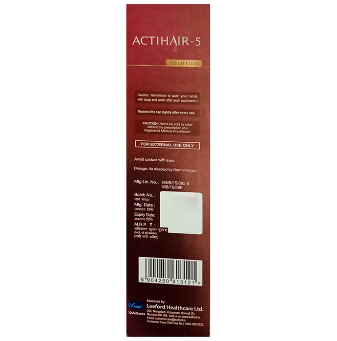 Is the hair growth by Actihair 5 Solution treatment permanent?::: You have to continue applying Actihair 5 Solution for continued hair growth. If you stop using Actihair 5 Solution, the regrown hair may disappear after 3-4 months and balding or hair loss may restart.| How long does it take to see results with Actihair 5 Solution?::: Since hair growth is a slow process, it may take some time before you see new hair growth after starting the treatment with Actihair 5 Solution. You need to use Actihair 5 Solution for 4 months to see its effects.| Do I need to wash my hair every day when using Actihair 5 Solution?::: No, it is not required to shampoo your hair every day before applying Actihair 5 Solution. However, if you shampoo your hair, make sure your scalp is dry before using Actihair 5 Solution.| How often should Actihair 5 Solution be applied?::: The general recommendation is that Actihair 5 Solution should be used twice daily. Follow your doctor’s instructions and take it in the dose and duration advised by your doctor.| Can Actihair 5 Solution be used for beard growth?::: No, Actihair 5 Solution should not be used for beard growth. It is indicated only for growth of hair on scalp in patients with a family history of hair loss.: