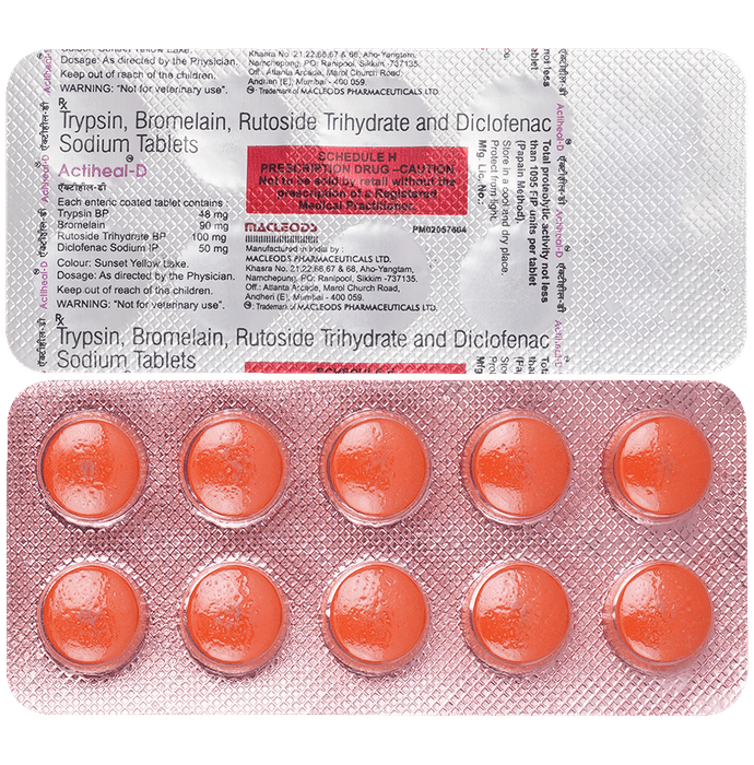 What is Actiheal-D Tablet?::: Actiheal-D Tablet is a combination of four medicines: Trypsin, Bromelain, Rutoside and Diclofenac. This medication helps in relieving pain and swelling (inflammation). It works by lowering the levels of those chemical substances in the body which cause pain and swelling (inflammation).| Can the use of Actiheal-D Tablet cause dizziness?::: Yes, the use of Actiheal-D Tablet can cause dizziness (feeling faint, weak, unsteady or lightheaded) in some patients. If you feel dizzy or lightheaded, it is better to rest for some time and resume once you feel better.| Are there any specific contraindications associated with the use of Actiheal-D Tablet?::: The use of Actiheal-D Tablet is considered to be harmful for patients with known allergy to painkillers (NSAIDs) or any of the components or excipients of this medicine. The use of this medicine should preferably be avoided in patients with a history of stomach ulcers or in patients with active, recurrent stomach ulcer / bleeding. It should also be avoided in patients with history of heart failure, high blood pressure, and liver or kidney disease.| Can I take a higher than the recommended dose of this medicine?::: No, taking a higher than the recommended dose of Actiheal-D Tablet can increase the risk of side effects like nausea, vomiting, heartburn, indigestion, diarrhea and can also damage your kidneys on long-term use. If you are experiencing increased severity of pain and swelling which is not relieved by the recommended doses of this medicine, please consult your doctor for re-evaluation.| What is the recommended storage condition for Actiheal-D Tablet?::: Keep this medicine in the container or the pack it came in, tightly closed. Store it according to the instructions mentioned on the pack or label. Dispose of the unused medicine. Make sure it is not consumed by pets, children and other people.| Can Actiheal-D Tablet be stopped when my pain and swelling (inflammation) are relieved?::: Actiheal-D Tablet is usually used for short term and can be discontinued when pain and swelling are relieved. However, Actiheal-D Tablet should be continued if the doctor has advised you to do so.| Can the use of Actiheal-D Tablet cause nausea and vomiting?::: Yes, the use of Actiheal-D Tablet can cause nausea and vomiting. Taking it with milk, food or with antacids can prevent nausea. Avoid taking fatty or fried foods along with this medicine. In case of vomiting, drink plenty of water or other fluids by taking small frequent sips. Talk to your doctor if vomiting persists and you notice signs of dehydration, like dark colored and strong-smelling urine and a low frequency of urination. Do not take any other medicine without speaking to a doctor.: