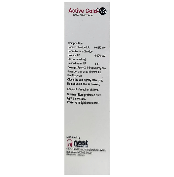 Can I use Active Cold-NS Nasal Drops for nebulizer?::: Yes, Active Cold-NS Nasal Drops can be used in the nebulizer. It is used to produce phlegm and sputum which can help to improve lung function in patients with lung diseases. It may also be used to dilute other medications to be inhaled through a nebulizer. However, all these uses would depend upon your doctor’s prescription.:
