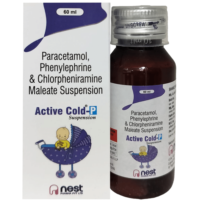 What is Active Cold-P Oral Suspension?::: Active Cold-P Oral Suspension is a combination of three medicines: Chlorpheniramine, Paracetamol / Acetaminophen and Phenylephrine. This combination helps to relieve symptoms of cold like runny nose, watery eyes, fever and headache. Chlorpheniramine is an antiallergic. It relieves allergy symptoms like runny nose, watery eyes and sneezing. Paracetamol blocks the release of certain chemical messengers in the brain that are responsible for pain and fever. Phenylephrine is a decongestant which narrows the small blood vessels and provides relief from congestion or stuffiness in the nose.| Is it safe to use Active Cold-P Oral Suspension?::: Yes, Active Cold-P Oral Suspension is safe in most patients. However, in some patients it may cause common side effects like nausea, vomiting, allergic reaction, sleepiness, headache and other uncommon or rare side effects. Inform the doctor if you experience any persistent problem while taking this medicine.| Can I stop taking Active Cold-P Oral Suspension when I am relieved of my symptoms?::: Active Cold-P Oral Suspension is usually used for short term and can be discontinued when your symptoms are relieved. However, continue taking this medicine if your doctor has advised you to do so.| Can the use of Active Cold-P Oral Suspension cause dizziness?::: Yes, the use of Active Cold-P Oral Suspension can cause dizziness (feeling faint, weak, unsteady or lightheaded) in some patients. If you feel dizzy or lightheaded, it is better to rest for some time and resume once you feel better.| Can the use of Active Cold-P Oral Suspension cause damage to liver?::: Active Cold-P Oral Suspension is usually safe when taken according to the recommended dose. However, an overdose of Active Cold-P Oral Suspension can damage your liver. Avoid drinking alcohol, while taking this medicine as it may increase your risk of liver damage.| What is the recommended storage condition for the Active Cold-P Oral Suspension?::: Keep this medicine in the container or the pack it came in, tightly closed. Store it according to the instructions mentioned on the pack or label. Dispose of the unused medicine. Make sure it is not consumed by pets, children and other people.:
