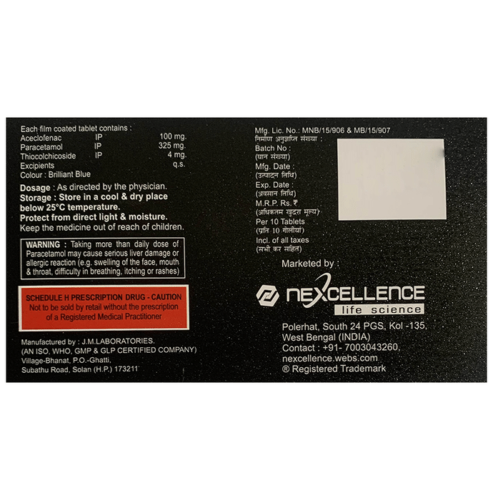 Thiocolchicoside (4mg) + Aceclofenac (100mg) + Paracetamol (325mg):<packagingdetail>:Strip: